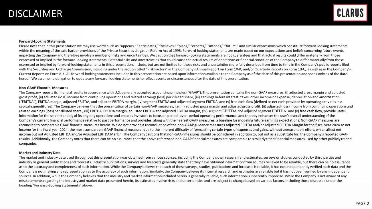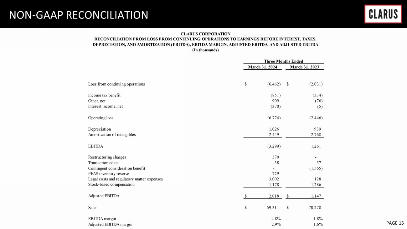 6 February 2023 PAGE 14 NON - GAAP RECONCILIATION As reported $ 69,311 $ 24,851 $ 31,625 $ (851) (11.6) % $ (6,462) $ (0.17) Amortization of intangibles - - (2,449) 617 1,832 Restructuring charges - - (370) 59 311 Transaction costs - - (38) 6 32 PFAS inventory reserve - 729 - 114 615 Legal costs and regulatory matter expenses - - (3,002) 461 2,541 Stock-based compensation - - (1,178) 181 997 As adjusted $ 69,311 $ 25,580 $ 24,588 $ 587 129.6 % $ (134) $ (0.00) As reported $ 70,278 $ 25,508 $ 27,954 $ (334) (14.1) % $ (2,031) $ (0.05) Amortization of intangibles - - (2,768) 278 2,490 Transaction costs - - (37) 6 31 Contingent consideration (benefit) expense - - 1,565 (335) (1,230) Legal costs and regulatory matter expenses - - (128) 2 126 Stock-based compensation - - (1,286) 277 1,009 As adjusted $ 70,278 $ 25,508 $ 25,300 $ (106) (36.7) % $ 395 $ 0.01 CLARUS CORPORATION RECONCILIATION FROM LOSS FROM CONTINUING OPERATIONS TO ADJUSTED (LOSS) INCOME FROM CONTINUING OPERATIONS AND RELATED EARNINGS PER DILUTED SHARE (In thousands, except per share amounts) Three Months Ended March 31, 2024 Total Gross Operating Income tax Tax Loss from Diluted sales profit expenses (benefit) expense rate continuing operations EPS (1) (1) Potentially dilutive securities are excluded from the computation of diluted earnings (loss) per share if their effect is anti-dilutive to the loss from continuing operations. Reported loss from continuing operations per share and adjusted loss from continuing operations per share are both calculated based on 38,208 basic and diluted weighted average shares of common Three Months Ended March 31, 2023 Total Gross Operating Income tax continuing operations EPS (1) (1) Potentially dilutive securities are excluded from the computation of diluted earnings (loss) per share if their effect is anti-dilutive to the loss from continuing operations. Reported loss from continuing operations per share is calculated based on 37,137 basic and diluted weighted average shares of common stock. Adjusted income from continuing operations per share is calculated based on 38,109 diluted shares of common stock. Tax (Loss) income from Diluted sales profit expenses (benefit) expense rate