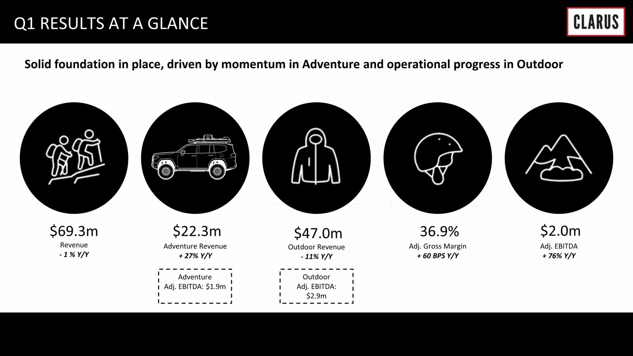 Solid foundation in place, driven by momentum in Adventure and operational progress in Outdoor $ 69.3m $22.3 m $47.0 m 36.9 % $ 2.0m Revenue - 1 % Y/Y Adventure Revenue + 27% Y/Y Outdoor Revenue - 11% Y/Y Adj. Gross Margin + 60 BPS Y/Y Adj. EBITDA + 76% Y/Y Q1 RESULTS AT A GLANCE Adventure Adj. EBITDA: $1.9m Outdoor Adj. EBITDA: $2.9m