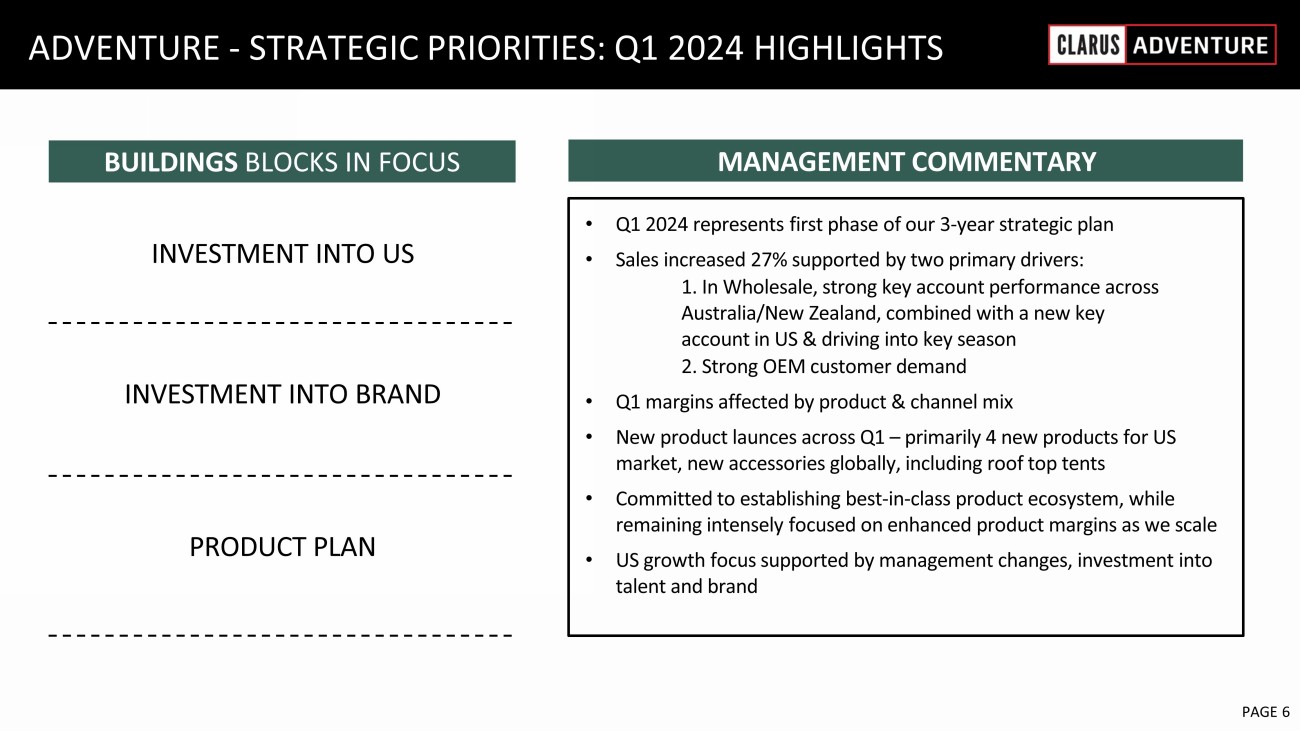 6 February 2023 PAGE 4 THE NEW CLARUS: Q1 2024 Positioned for long - term growth as pure - play outdoor business Q1 execution consistent with strategic objectives Black Diamond Objective : Simplify and focus on the core Cathedral specialty, regional and national wholesale accounts stabilizing; SKU rationalization on track Adventure Objective: Invest to scale Global investment in marketing programs yielding better brand awareness; additional investment in personnel Strong balance sheet/ p rudent capital allocation Debt - free with $47.5 million of cash on the balance sheet at 3/31