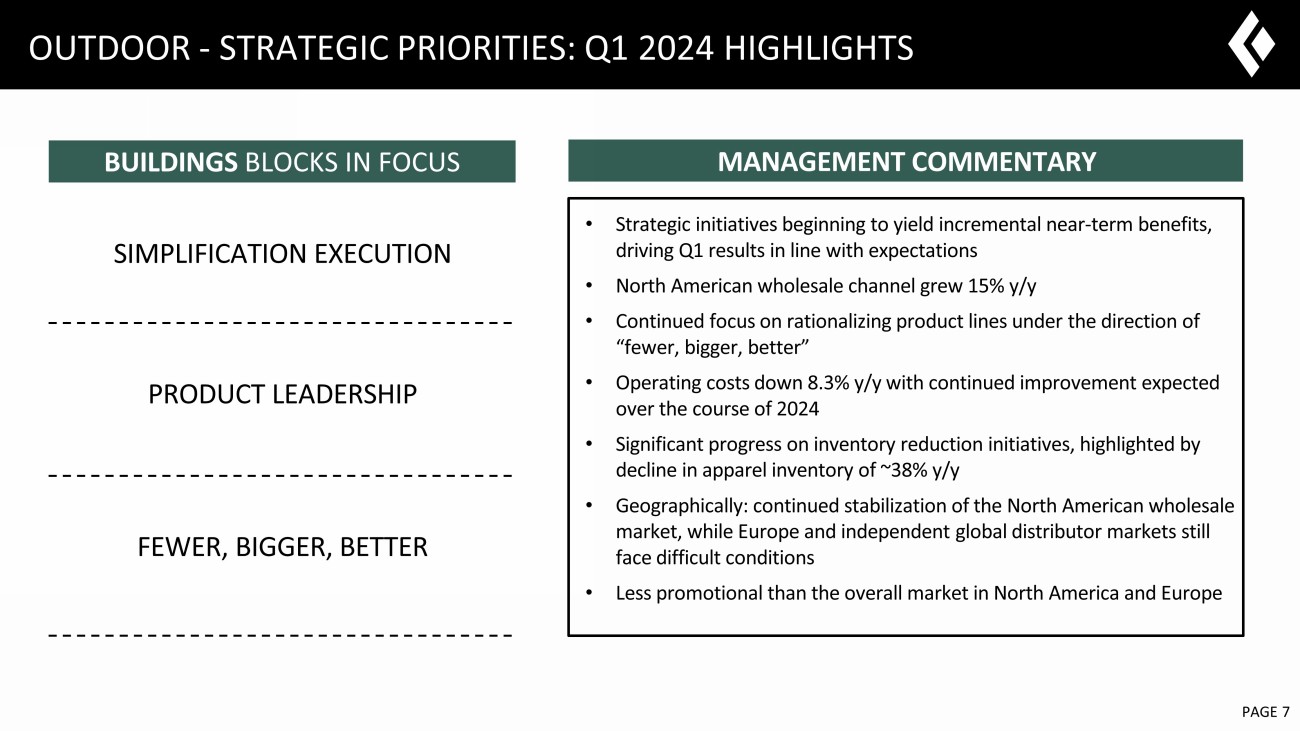 6 February 2023 PAGE 6 ADVENTURE - STRATEGIC PRIORITIES: Q1 2024 HIGHLIGHTS • Q1 2024 represents first phase of our 3 - year strategic plan • Sales increased 27% supported by two primary drivers: 1. In Wholesale, strong key account performance across Australia/New Zealand, combined with a new key account in US & driving into key season 2. Strong OEM customer demand • Q1 margins affected by product & channel mix • New product launces across Q1 – primarily 4 new products for US market, new accessories globally, including roof top tents • Committed to establishing best - in - class product ecosystem, while remaining intensely focused on enhanced product margins as we scale • US growth focus supported by management changes, investment into talent and brand MANAGEMENT COMMENTARY BUILDINGS BLOCKS IN FOCUS INVESTMENT INTO US INVESTMENT INTO BRAND PRODUCT PLAN
