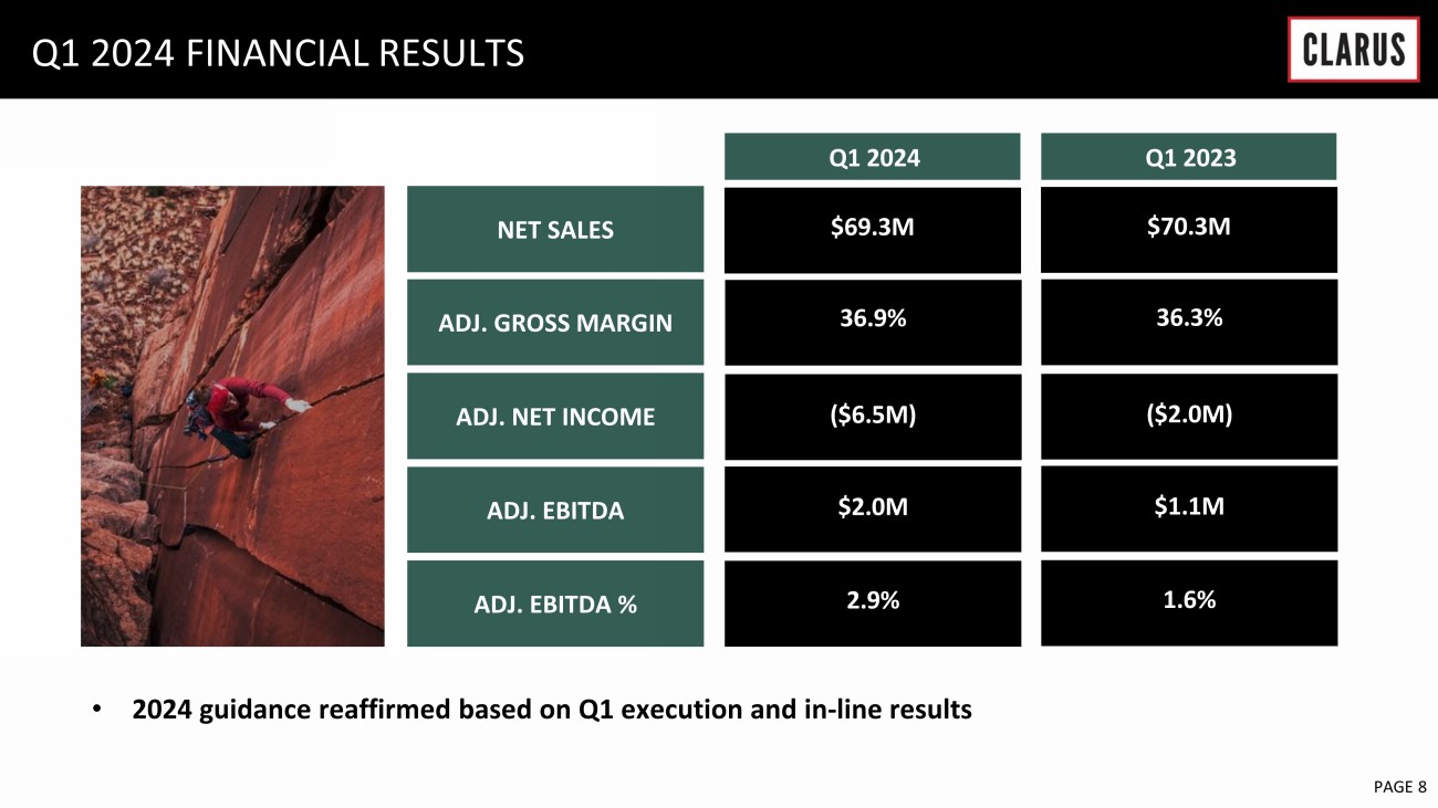 6 February 2023 PAGE 8 NET SALES Q1 2024 FINANCIAL RESULTS Q1 202 4 Q1 2023 ADJ. GROSS MARGIN ADJ. NET INCOME ADJ. EBITDA ADJ. EBITDA % • 2024 guidance reaffirmed base d on Q 1 execution and in - line results 2.9% $ 2.0 M ($6.5M) 36.9% $69.3M 1.6% $1.1M ($2.0M) 36.3% $70.3M