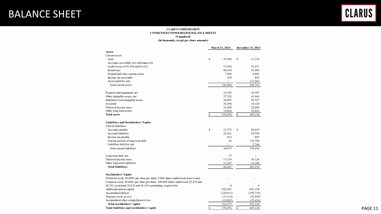 6 February 2023 PAGE 11 BALANCE SHEET Assets Current assets Cash $ 47,484 $ 11,324 Accounts receivable, less allowance for credit losses of $1,394 and $1,412 51,954 53,971 Inventories 88,630 91,409 Prepaid and other current assets 7,966 4,865 Income tax receivable 930 892 Assets held for sale - 137,284 Total current assets 196,964 299,745 Property and equipment, net 16,345 16,587 Other intangible assets, net 37,526 41,466 Indefinite-lived intangible assets 56,897 58,527 Goodwill 38,300 39,320 Deferred income taxes 16,280 22,869 Other long-term assets 14,664 16,824 Total assets $ 376,976 $ 495,338 Liabilities and Stockholders’ Equity Current liabilities Accounts payable $ 12,772 $ 20,015 Accrued liabilities 22,441 24,580 Income tax payable 816 805 Current portion of long-term debt 44 119,790 Liabilities held for sale - 5,744 Total current liabilities 36,073 170,934 Long-term debt, net 37 - Deferred income taxes 17,324 18,124 Other long-term liabilities 13,167 14,160 Total liabilities 66,601 203,218 Stockholders’ Equity Preferred stock, $0.0001 par value per share; 5,000 shares authorized; none issued - - Common stock, $0.0001 par value per share; 100,000 shares authorized; 42,878 and 42,761 issued and 38,236 and 38,149 outstanding, respectively 4 4 Additional paid in capital 692,381 691,198 Accumulated deficit (329,811) (350,739) Treasury stock, at cost (33,114) (32,929) Accumulated other comprehensive loss (19,085) (15,414) Total stockholders’ equity 310,375 292,120 Total liabilities and stockholders’ equity $ 376,976 $ 495,338 March 31, 2024 December 31, 2023 CLARUS CORPORATION CONDENSED CONSOLIDATED BALANCE SHEETS (Unaudited) (In thousands, except per share amounts)