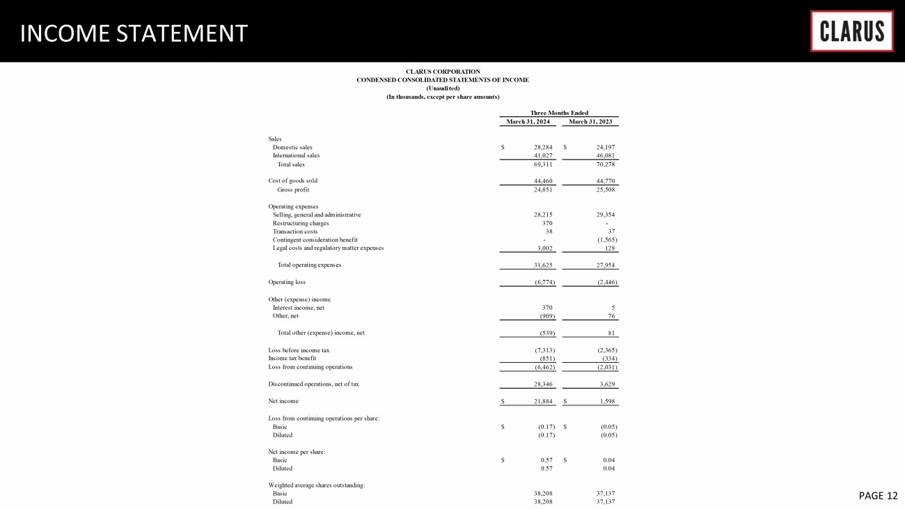 6 February 2023 PAGE 12 INCOME STATEMENT Sales Domestic sales $ 28,284 $ 24,197 International sales 41,027 46,081 Total sales 69,311 70,278 Cost of goods sold 44,460 44,770 Gross profit 24,851 25,508 Operating expenses Selling, general and administrative 28,215 29,354 Restructuring charges 370 - Transaction costs 38 37 Contingent consideration benefit - (1,565) Legal costs and regulatory matter expenses 3,002 128 Total operating expenses 31,625 27,954 Operating loss (6,774) (2,446) Other (expense) income Interest income, net 370 5 Other, net (909) 76 Total other (expense) income, net (539) 81 Loss before income tax (7,313) (2,365) Income tax benefit (851) (334) Loss from continuing operations (6,462) (2,031) Discontinued operations, net of tax 28,346 3,629 Net income $ 21,884 $ 1,598 Loss from continuing operations per share: Basic $ (0.17) $ (0.05) Diluted (0.17) (0.05) Net income per share: Basic $ 0.57 $ 0.04 Diluted 0.57 0.04 Weighted average shares outstanding: Basic 38,208 37,137 Diluted 38,208 37,137 March 31, 2024 March 31, 2023 CLARUS CORPORATION CONDENSED CONSOLIDATED STATEMENTS OF INCOME (Unaudited) (In thousands, except per share amounts) Three Months Ended