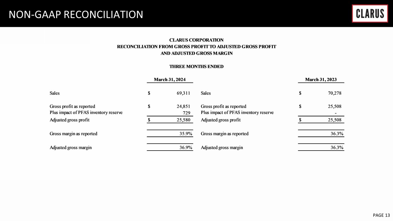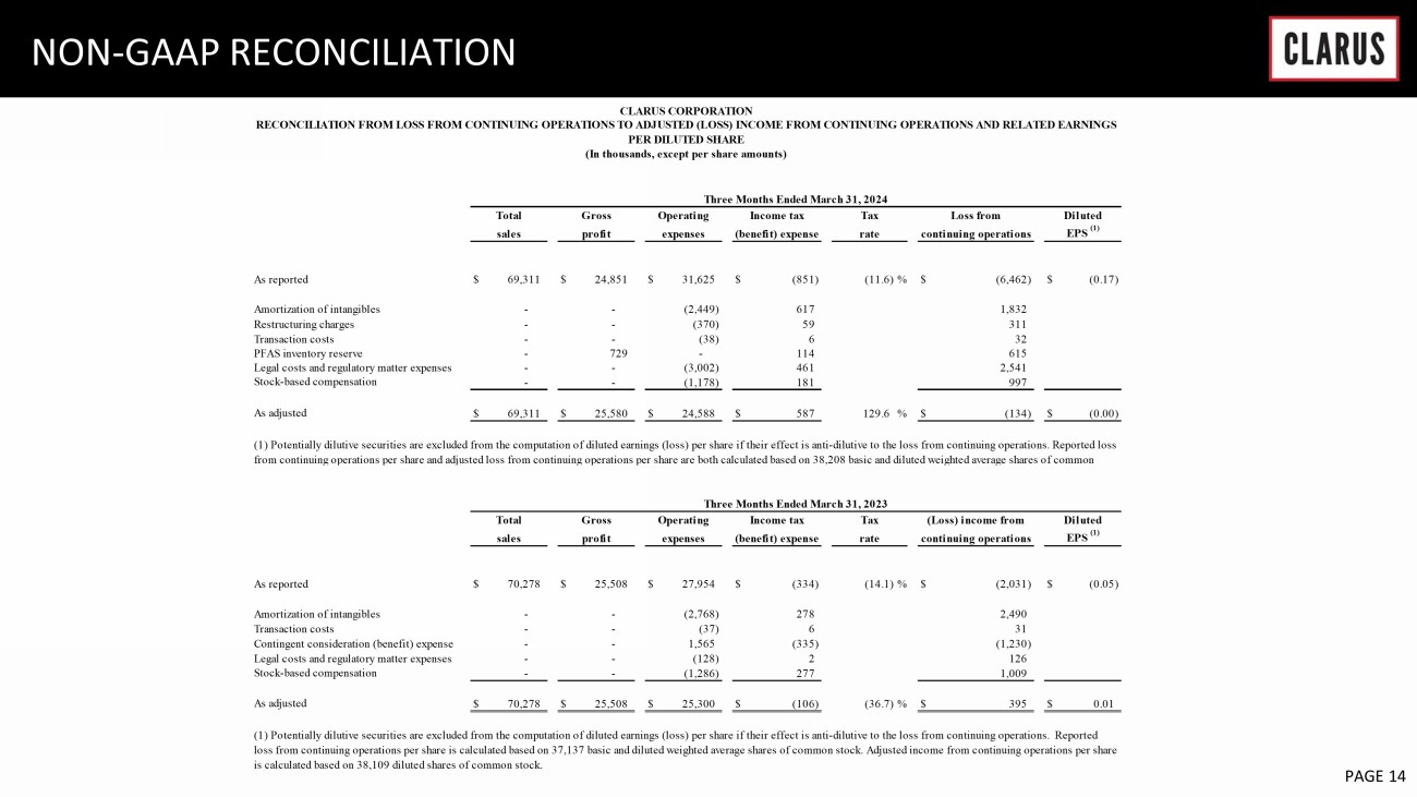 6 February 2023 PAGE 13 NON - GAAP RECONCILIATION Sales $ 69,311 Sales $ 70,278 Gross profit as reported $ 24,851 Gross profit as reported $ 25,508 Plus impact of PFAS inventory reserve 729 Plus impact of PFAS inventory reserve - Adjusted gross profit $ 25,580 Adjusted gross profit $ 25,508 Gross margin as reported 35.9% Gross margin as reported 36.3% Adjusted gross margin 36.9% Adjusted gross margin 36.3% CLARUS CORPORATION RECONCILIATION FROM GROSS PROFIT TO ADJUSTED GROSS PROFIT AND ADJUSTED GROSS MARGIN THREE MONTHS ENDED March 31, 2024 March 31, 2023