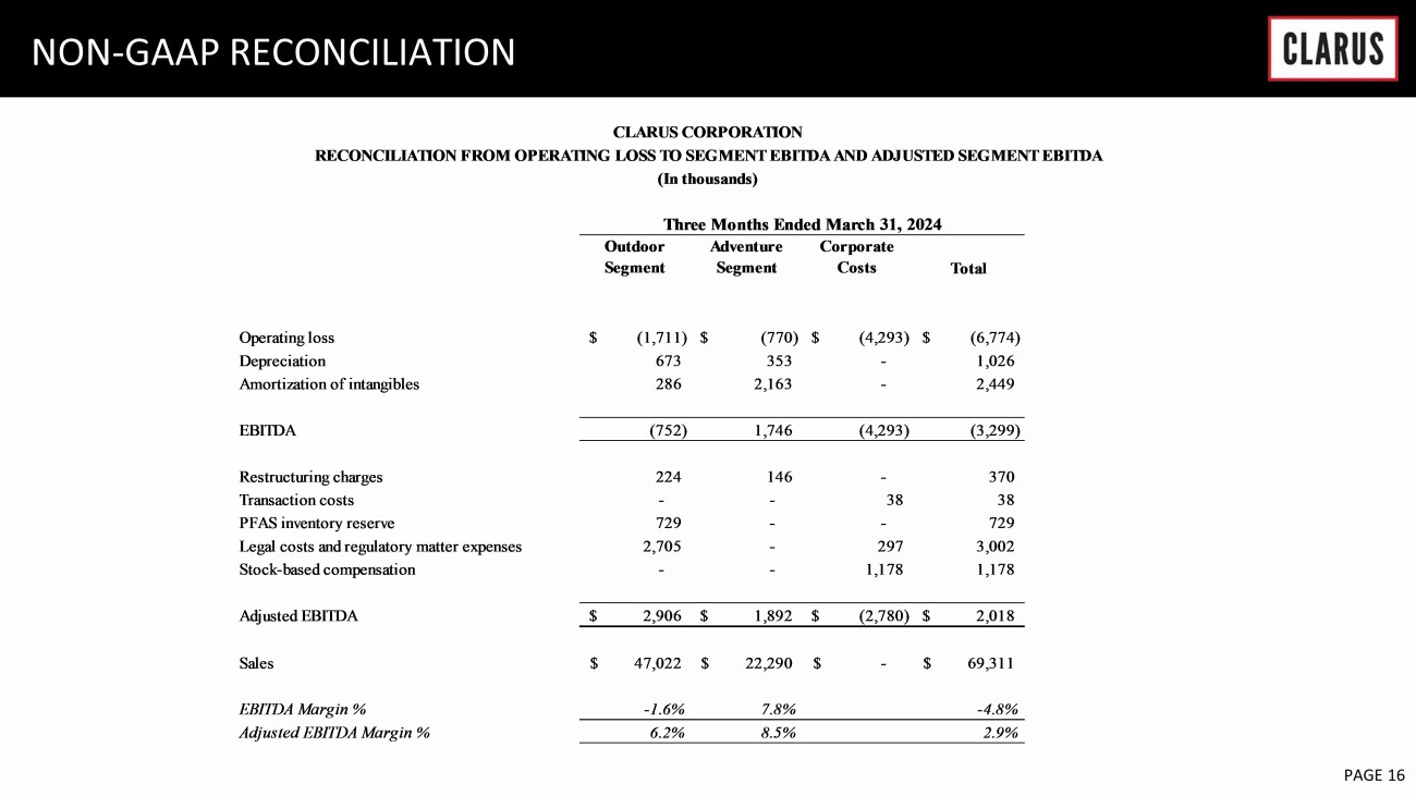 6 February 2023 PAGE 15 NON - GAAP RECONCILIATION Loss from continuing operations $ (6,462) $ (2,031) Income tax benefit (851) (334) Other, net 909 (76) Interest income, net (370) (5) Operating loss (6,774) (2,446) Depreciation 1,026 939 Amortization of intangibles 2,449 2,768 EBITDA (3,299) 1,261 Restructuring charges 370 - Transaction costs 38 37 Contingent consideration benefit - (1,565) PFAS inventory reserve 729 - Legal costs and regulatory matter expenses 3,002 128 Stock-based compensation 1,178 1,286 Adjusted EBITDA $ 2,018 $ 1,147 Sales $ 69,311 $ 70,278 EBITDA margin -4.8% 1.8% Adjusted EBITDA margin 2.9% 1.6% March 31, 2024 March 31, 2023 CLARUS CORPORATION RECONCILIATION FROM LOSS FROM CONTINUING OPERATIONS TO EARNINGS BEFORE INTEREST, TAXES, DEPRECIATION, AND AMORTIZATION (EBITDA), EBITDA MARGIN, ADJUSTED EBITDA, AND ADJUSTED EBITDA (In thousands) Three Months Ended