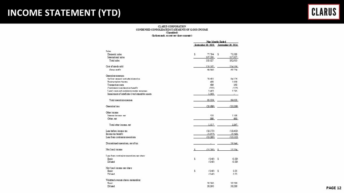 6 February 2023 PAGE 11 INCOME STATEMENT (Q3) Sales Domestic sales $ 28,261 $ 24,365 International sales 41,086 42,750 Total sales 69,347 67,115 Cost of goods sold 44,981 43,618 Gross profit 24,366 23,497 Operating expenses Selling, general and administrative 26,155 27,880 Restructuring charges 155 478 Transaction costs 436 103 Contingent consideration benefit (355) - Legal costs and regulatory matter expenses 1,001 394 Total operating expenses 27,392 28,855 Operating loss (3,026) (5,358) Other (expense) income Interest income, net 108 373 Other, net (943) 1,164 Total other (expense) income, net (835) 1,537 Loss before income tax (3,861) (3,821) Income tax benefit (2,244) (664) Net loss $ (1,617) $ (3,157) Net loss per share: Basic $ (0.04) $ (0.08) Diluted (0.04) (0.08) Weighted average shares outstanding: Basic 38,402 38,352 Diluted 38,402 38,352 CLARUS CORPORATION CONDENSED CONSOLIDATED STATEMENTS OF LOSS (Unaudited) (In thousands, except per share amounts) Three Months Ended September 30, 2025 September 30, 2024