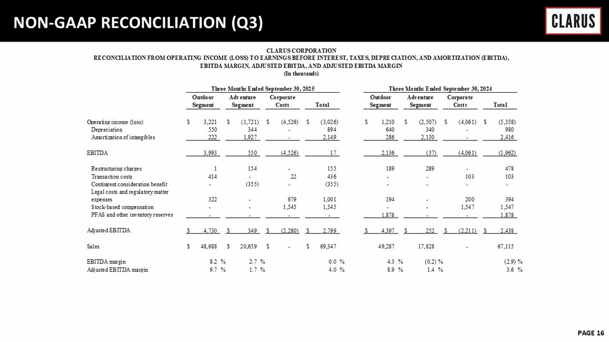 6 February 2023 PAGE 15 NON - GAAP RECONCILIATION (YTD) As reported $ 185,027 $ 64,840 $ 85,529 $ (3,877) (20.2) % $ (15,295) $ (0.40) Amortization of intangibles - - (6,586) 2,263 4,323 Impairment of indefinite-lived intangible assets - - (1,565) - 1,565 Disposal of internally developed software - - (365) 177 188 Restructuring charges - - (489) 186 303 Transaction costs - - (686) (1) 687 Contingent consideration benefit - - 355 - (355) Inventory fair value of purchase accounting - 120 - - 120 Other inventory reserves - 490 - - 490 Legal costs and regulatory matter expenses - - (3,463) (3) 3,466 Stock-based compensation - - (4,568) (1) 4,569 As adjusted $ 185,027 $ 65,450 $ 68,162 $ (1,256) 105.1 % $ 61 $ 0.00 As reported $ 192,910 $ 68,754 $ 89,023 $ (3,290) (17.9) % $ (15,112) $ (0.39) Amortization of intangibles - - (7,316) 1,511 5,805 Restructuring charges - - (1,009) 208 801 Transaction costs - - (168) 35 133 Contingent consideration benefit - - 125 (26) (99) PFAS inventory reserve - 3,323 - 687 2,636 Legal costs and regulatory matter expenses - - (3,795) 784 3,011 Stock-based compensation - - (4,253) 879 3,374 As adjusted $ 192,910 $ 72,077 $ 72,607 $ 788 58.9 % $ 549 $ 0.01 CLARUS CORPORATION RECONCILIATION FROM LOSS FROM CONTINUING OPERATIONS TO ADJUSTED INCOME FROM CONTINUING OPERATIONS AND RELATED EARNINGS PER DILUTED SHARE (In thousands, except per share amounts) Nine Months Ended September 30, 2025 Total Gross Operating Income tax Tax (Loss) income from Diluted sales profit expenses benefit rate continuing operations EPS (1) (1) Potentially dilutive securities are excluded from the computation of diluted earnings (loss) per share if their effect is anti-dilutive to the loss from continuing operations. Reported loss from continuing operations per share is calculated based on 38,390 basic and diluted weighted average shares of common stock. Adjusted income from continuing operations per share is calculated based on 38,440 diluted shares of common stock. Nine Months Ended September 30, 2024 Total Gross Operating Income tax continuing operations EPS (1) (1) Potentially dilutive securities are excluded from the computation of diluted earnings (loss) per share if their effect is anti-dilutive to the loss from continuing operations. Reported loss from continuing operations per share is calculated based on 38,286 basic and diluted weighted average shares of common stock. Adjusted income from continuing operations per share is calculated based on 38,426 diluted shares of common stock. Tax (Loss) income from Diluted sales profit expenses (benefit) expense rate