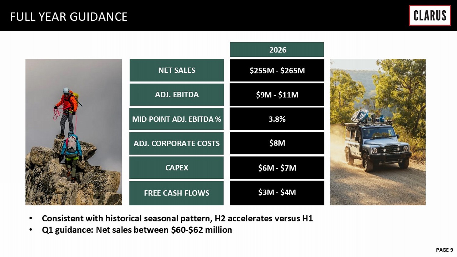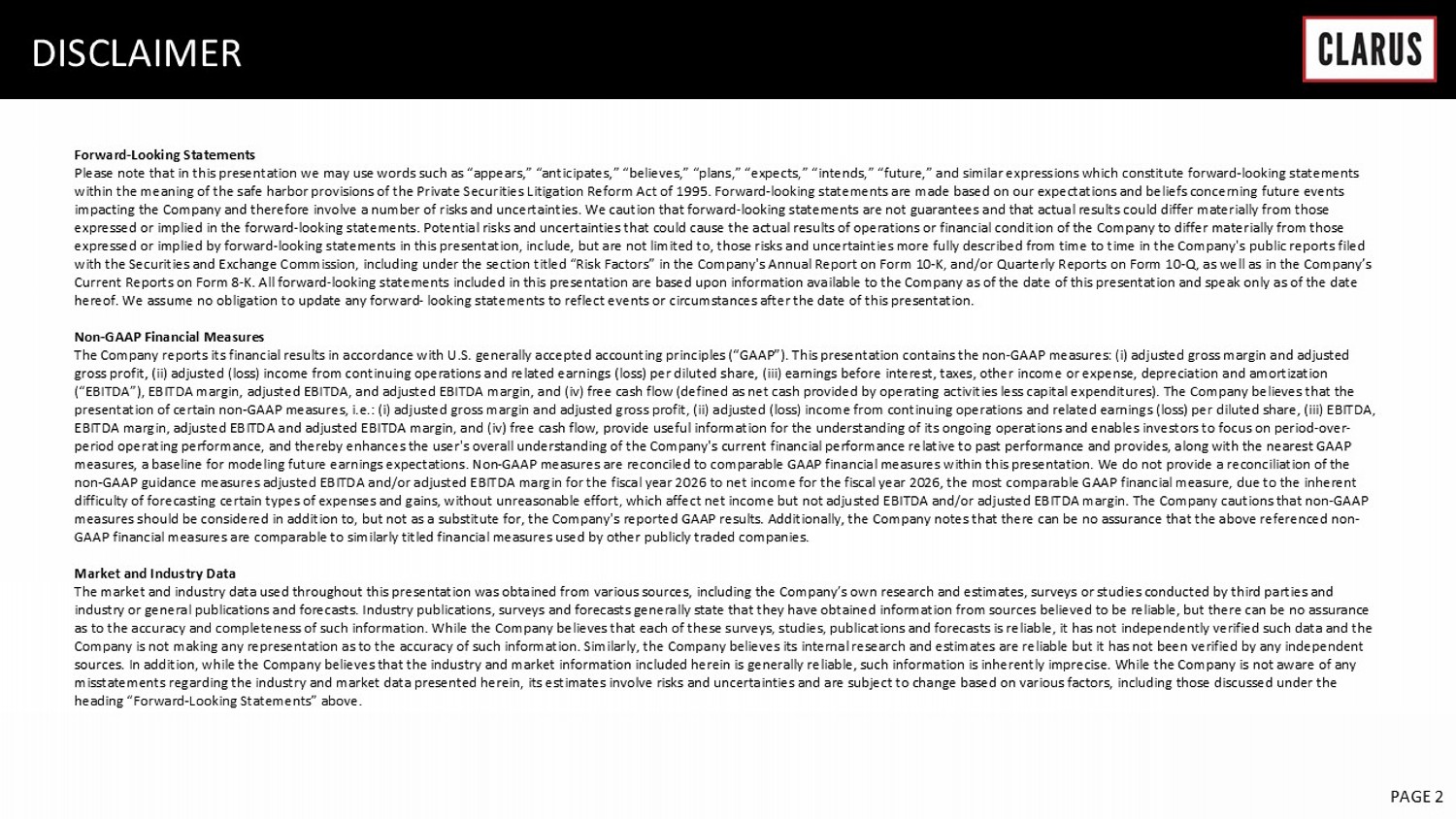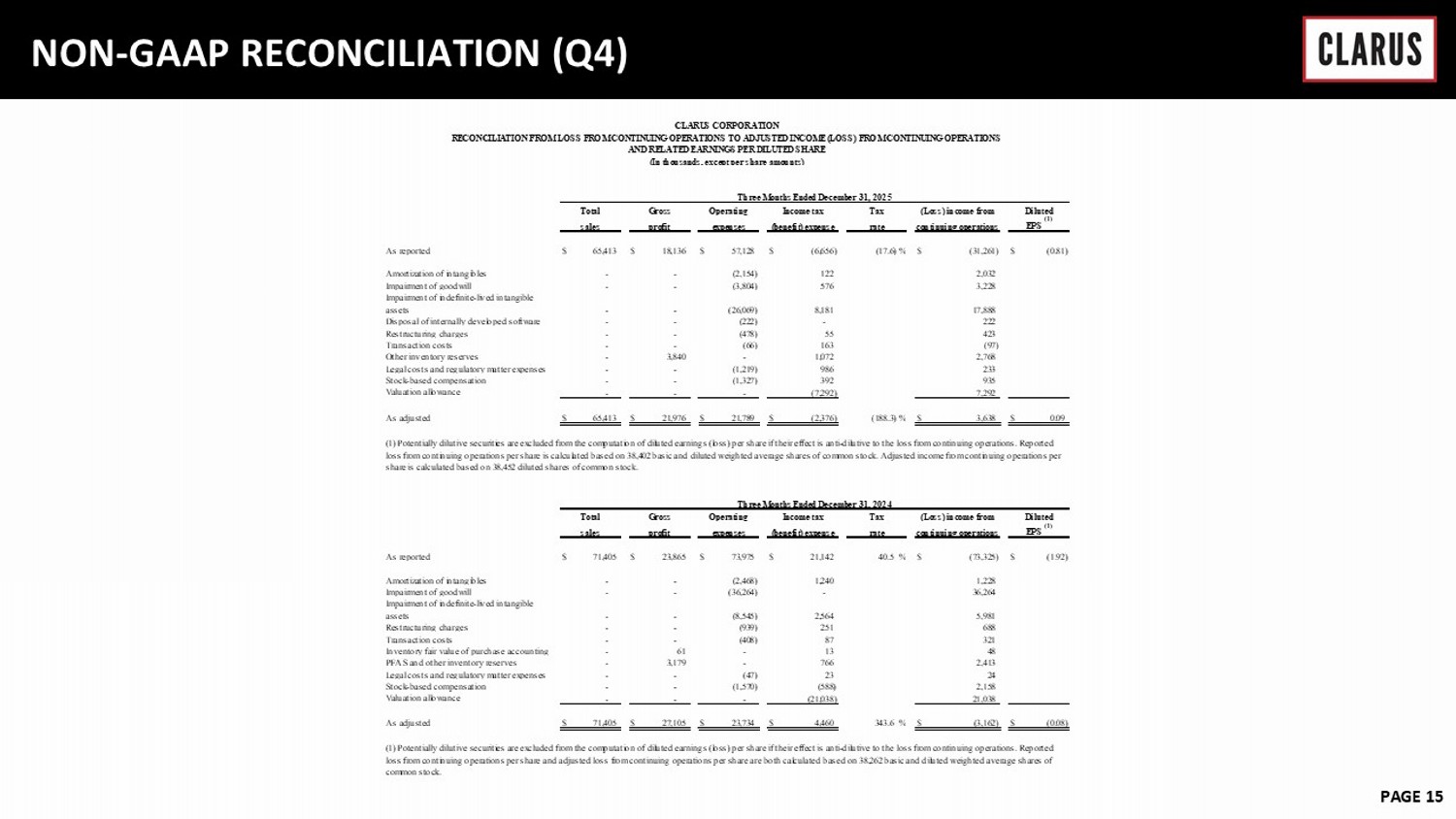 6 February 2023 PAGE 15 NON - GAAP RECONCILIATION (Q4) As reported $ 65,413 $ 18,136 $ 57,128 $ (6,656) (17.6) % $ (31,261) $ (0.81) Amortization of intangibles - - (2,154) 122 2,032 Impairment of goodwill - - (3,804) 576 3,228 Impairment of indefinite-lived intangible assets - - (26,069) 8,181 17,888 Disposal of internally developed software - - (222) - 222 Restructuring charges - - (478) 55 423 Transaction costs - - (66) 163 (97) Other inventory reserves - 3,840 - 1,072 2,768 Legal costs and regulatory matter expenses - - (1,219) 986 233 Stock-based compensation - - (1,327) 392 935 Valuation allowance - - - (7,292) 7,292 As adjusted $ 65,413 $ 21,976 $ 21,789 $ (2,376) (188.3) % $ 3,638 $ 0.09 As reported $ 71,405 $ 23,865 $ 73,975 $ 21,142 40.5 % $ (73,325) $ (1.92) Amortization of intangibles - - (2,468) 1,240 1,228 Impairment of goodwill - - (36,264) - 36,264 Impairment of indefinite-lived intangible assets - - (8,545) 2,564 5,981 Restructuring charges - - (939) 251 688 Transaction costs - - (408) 87 321 Inventory fair value of purchase accounting - 61 - 13 48 PFAS and other inventory reserves - 3,179 - 766 2,413 Legal costs and regulatory matter expenses - - (47) 23 24 Stock-based compensation - - (1,570) (588) 2,158 Valuation allowance - - - (21,038) 21,038 As adjusted $ 71,405 $ 27,105 $ 23,734 $ 4,460 343.6 % $ (3,162) $ (0.08) CLARUS CORPORATION RECONCILIATION FROM LOSS FROM CONTINUING OPERATIONS TO ADJUSTED INCOME (LOSS) FROM CONTINUING OPERATIONS AND RELATED EARNINGS PER DILUTED SHARE (In thousands, except per share amounts) Three Months Ended December 31, 2025 Total Gross Operating Income tax Tax (Loss) income from Diluted sales profit expenses (benefit) expense rate continuing operations EPS (1) (1) Potentially dilutive securities are excluded from the computation of diluted earnings (loss) per share if their effect is anti-dilutive to the loss from continuing operations. Reported loss from continuing operations per share is calculated based on 38,402 basic and diluted weighted average shares of common stock. Adjusted income from continuing operations per share is calculated based on 38,452 diluted shares of common stock. Three Months Ended December 31, 2024 Total Gross Operating Income tax continuing operations EPS (1) (1) Potentially dilutive securities are excluded from the computation of diluted earnings (loss) per share if their effect is anti-dilutive to the loss from continuing operations. Reported loss from continuing operations per share and adjusted loss from continuing operations per share are both calculated based on 38,262 basic and diluted weighted average shares of common stock. Tax (Loss) income from Diluted sales profit expenses (benefit) expense rate