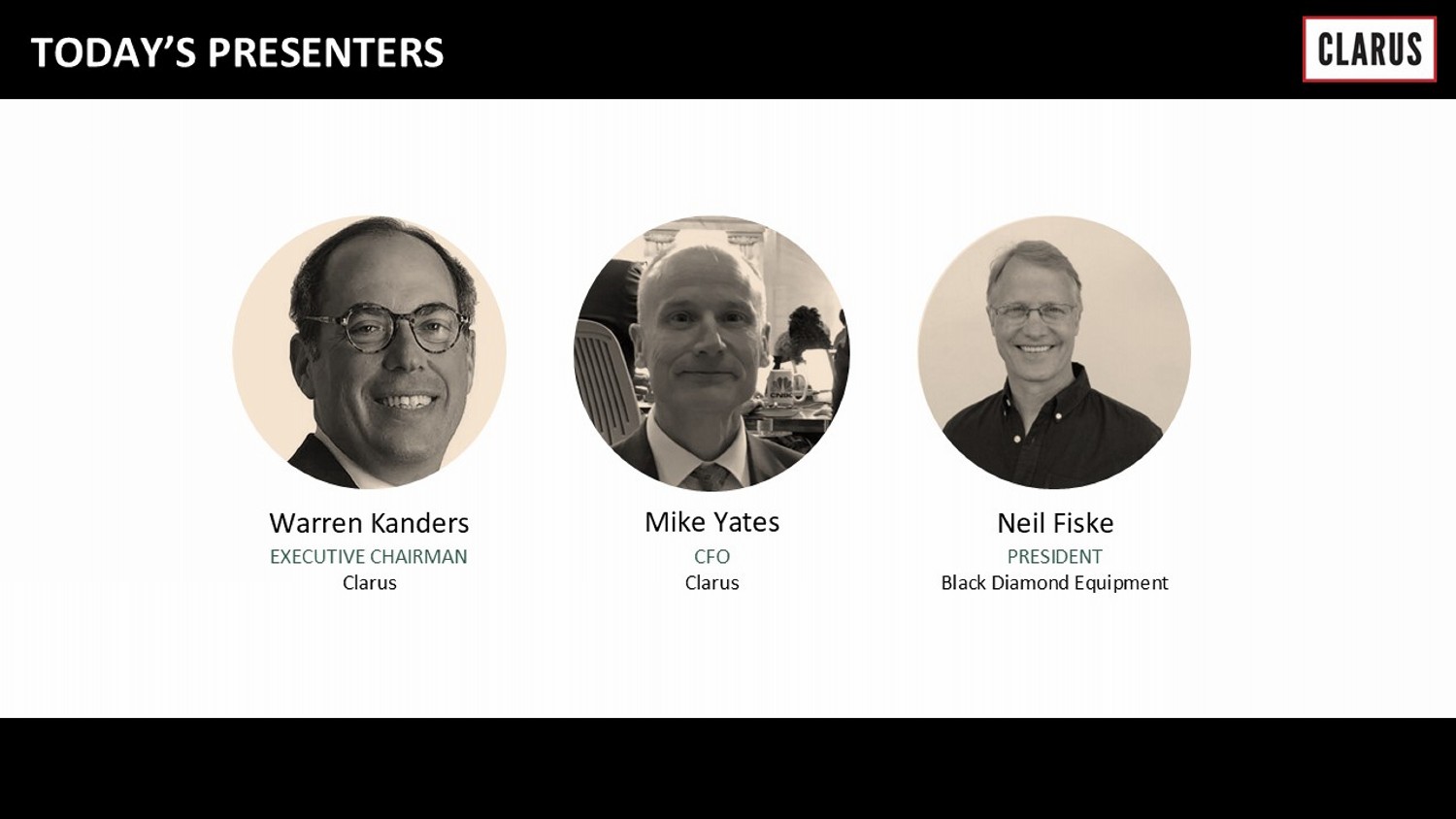 Warren Kanders EXECUTIVE CHAIRMAN Clarus TODAY’S PRESENTERS Mike Yates CFO Clarus Neil Fiske PRESIDENT Black Diamond Equipment
