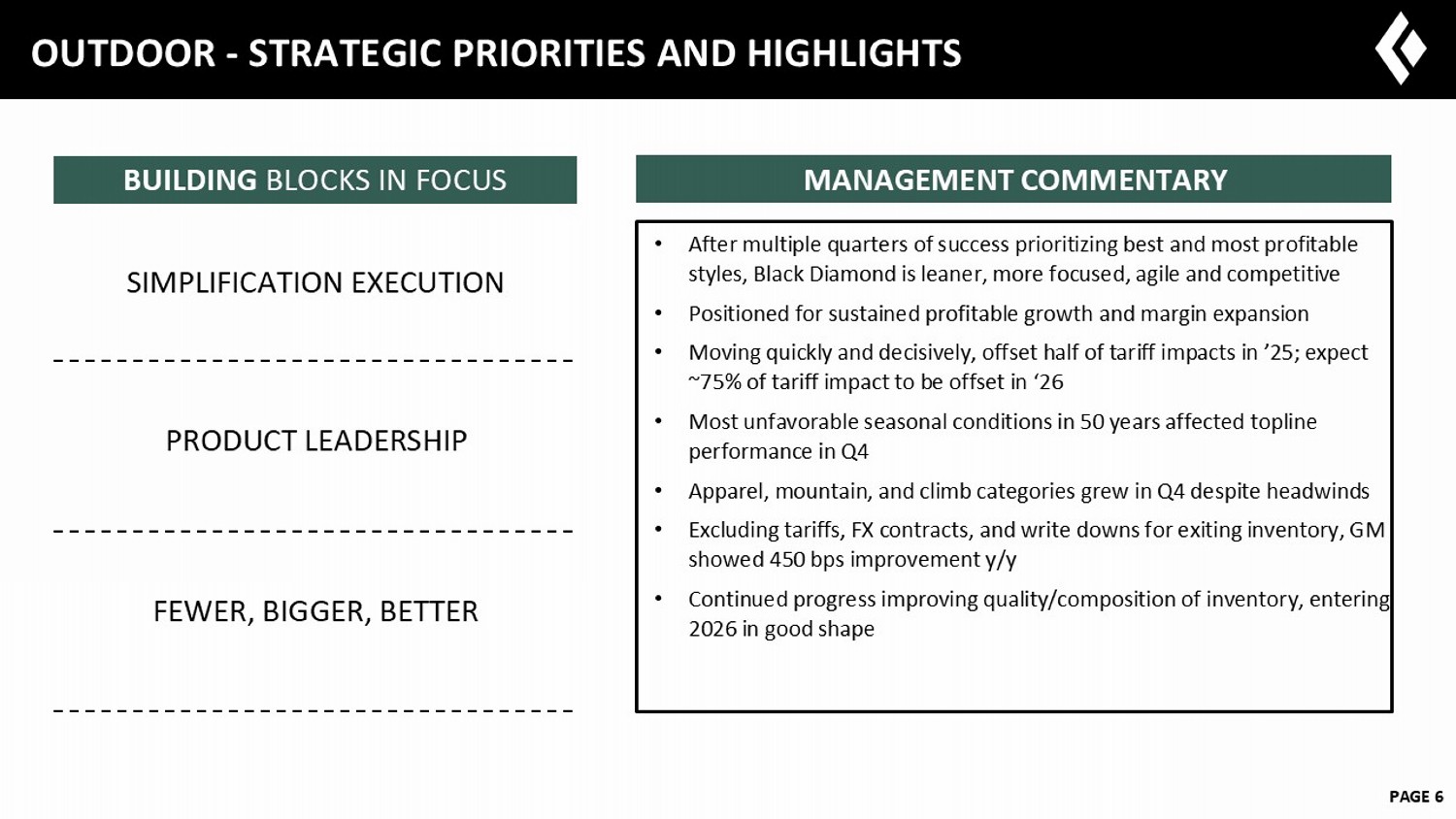 6 February 2023 PAGE 6 OUTDOOR - STRATEGIC PRIORITIES AND HIGHLIGHTS • After multiple quarters of success prioritizing best and most profitable styles, Black Diamond is leaner, more focused, agile and competitive • Positioned for sustained profitable growth and margin expansion • Moving quickly and decisively, offset half of tariff impacts in ’25; expect ~75% of tariff impact to be offset in ‘26 • Most unfavorable seasonal conditions in 50 years affected topline performance in Q4 • Apparel, mountain, and climb categories grew in Q4 despite headwinds • Excluding tariffs, FX contracts, and write downs for exiting inventory, GM showed 450 bps improvement y/y • Continued progress improving quality/composition of inventory, entering 2026 in good shape MANAGEMENT COMMENTARY BUILDING BLOCKS IN FOCUS SIMPLIFICATION EXECUTION PRODUCT LEADERSHIP FEWER, BIGGER, BETTER