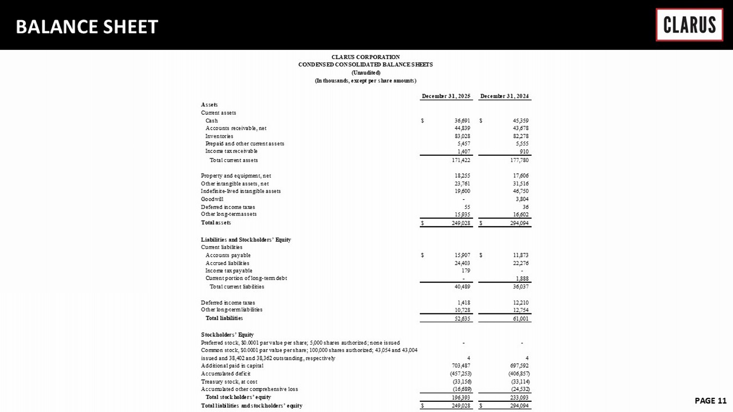 6 February 2023 PAGE 11 BALANCE SHEET Assets Current assets Cash $ 36,691 $ 45,359 Accounts receivable, net 44,839 43,678 Inventories 83,028 82,278 Prepaid and other current assets 5,457 5,555 Income tax receivable 1,407 910 Total current assets 171,422 177,780 Property and equipment, net 18,255 17,606 Other intangible assets, net 23,761 31,516 Indefinite-lived intangible assets 19,600 46,750 Goodwill - 3,804 Deferred income taxes 55 36 Other long-term assets 15,935 16,602 Total assets $ 249,028 $ 294,094 Liabilities and Stockholders’ Equity Current liabilities Accounts payable $ 15,907 $ 11,873 Accrued liabilities 24,403 22,276 Income tax payable 179 - Current portion of long-term debt - 1,888 Total current liabilities 40,489 36,037 Deferred income taxes 1,418 12,210 Other long-term liabilities 10,728 12,754 Total liabilities 52,635 61,001 Stockholders’ Equity Preferred stock, $0.0001 par value per share; 5,000 shares authorized; none issued - - Common stock, $0.0001 par value per share; 100,000 shares authorized; 43,054 and 43,004 issued and 38,402 and 38,362 outstanding, respectively 4 4 Additional paid in capital 703,487 697,592 Accumulated deficit (457,253) (406,857) Treasury stock, at cost (33,156) (33,114) Accumulated other comprehensive loss (16,689) (24,532) Total stockholders’ equity 196,393 233,093 Total liabilities and stockholders’ equity $ 249,028 $ 294,094 December 31, 2025 December 31, 2024 CLARUS CORPORATION CONDENSED CONSOLIDATED BALANCE SHEETS (Unaudited) (In thousands, except per share amounts)