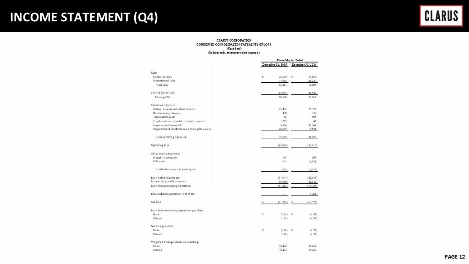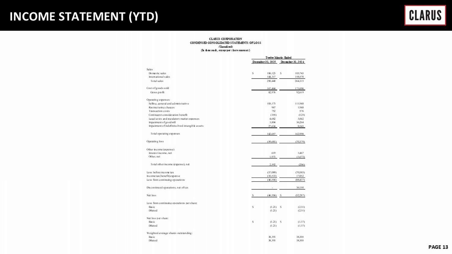 6 February 2023 PAGE 12 INCOME STATEMENT (Q4) Sales Domestic sales $ 28,329 $ 30,162 International sales 37,084 41,243 Total sales 65,413 71,405 Cost of goods sold 47,277 47,540 Gross profit 18,136 23,865 Operating expenses Selling, general and administrative 25,492 27,772 Restructuring charges 478 939 Transaction costs 66 408 Legal costs and regulatory matter expenses 1,219 47 Impairment of goodwill 3,804 36,264 Impairment of indefinite-lived intangible assets 26,069 8,545 Total operating expenses 57,128 73,975 Operating loss (38,992) (50,110) Other income (expense) Interest income, net 101 269 Other, net 974 (2,342) Total other income (expense), net 1,075 (2,073) Loss before income tax (37,917) (52,183) Income tax (benefit) expense (6,656) 21,142 Loss from continuing operations (31,261) (73,325) Discontinued operations, net of tax - 7,804 Net loss $ (31,261) $ (65,521) Loss from continuing operations per share: Basic $ (0.81) $ (1.92) Diluted (0.81) (1.92) Net loss per share: Basic $ (0.81) $ (1.71) Diluted (0.81) (1.71) Weighted average shares outstanding: Basic 38,402 38,262 Diluted 38,402 38,262 CLARUS CORPORATION CONDENSED CONSOLIDATED STATEMENTS OF LOSS (Unaudited) (In thousands, except per share amounts) Three Months Ended December 31, 2025 December 31, 2024