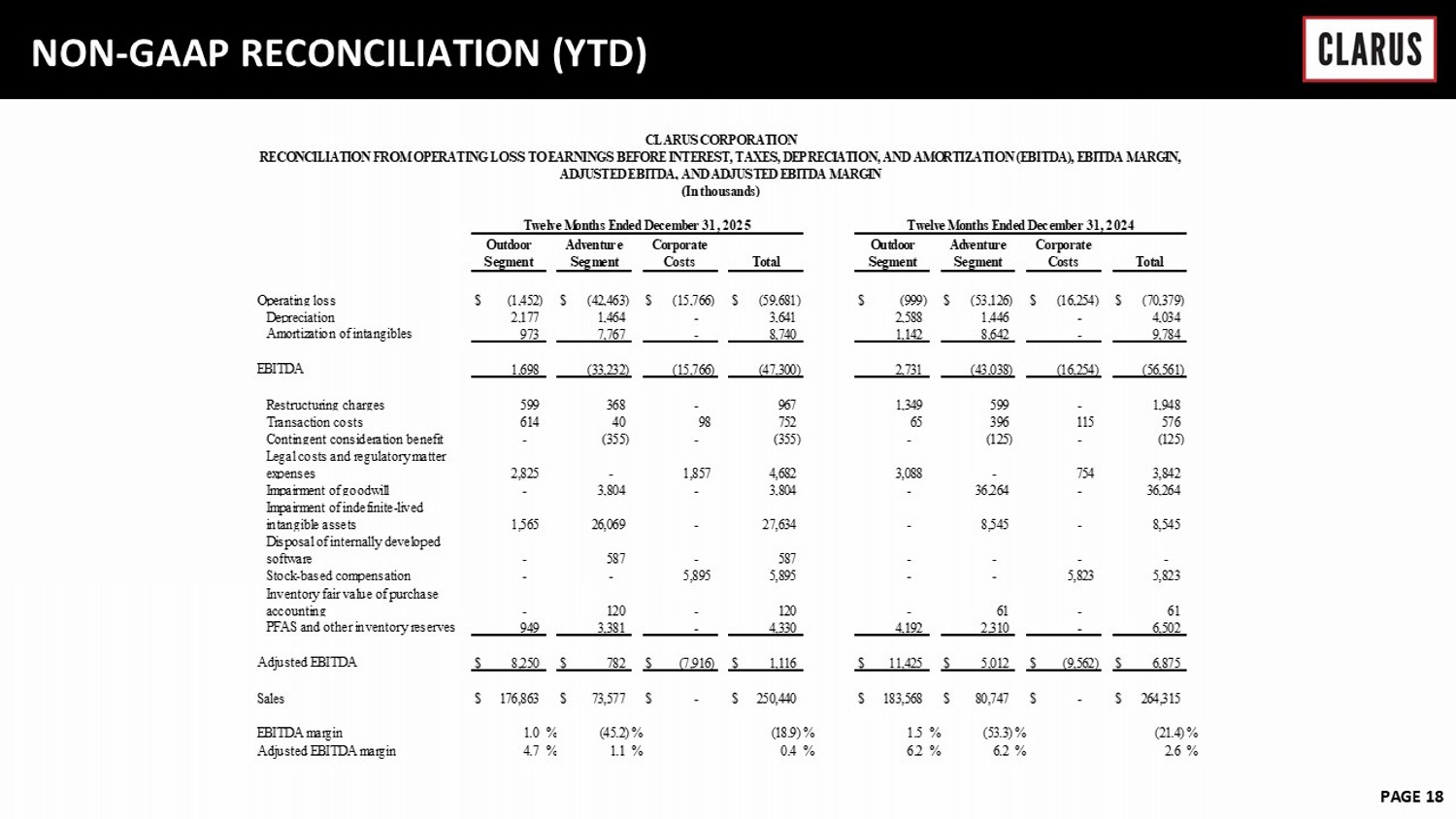 6 February 2023 PAGE 18 NON - GAAP RECONCILIATION (YTD) Operating loss $ (1,452) $ (42,463) $ (15,766) $ (59,681) $ (999) $ (53,126) $ (16,254) $ (70,379) Depreciation 2,177 1,464 - 3,641 2,588 1,446 - 4,034 Amortization of intangibles 973 7,767 - 8,740 1,142 8,642 - 9,784 EBITDA 1,698 (33,232) (15,766) (47,300) 2,731 (43,038) (16,254) (56,561) Restructuring charges 599 368 - 967 1,349 599 - 1,948 Transaction costs 614 40 98 752 65 396 115 576 Contingent consideration benefit - (355) - (355) - (125) - (125) Legal costs and regulatory matter expenses 2,825 - 1,857 4,682 3,088 - 754 3,842 Impairment of goodwill - 3,804 - 3,804 - 36,264 - 36,264 Impairment of indefinite-lived intangible assets 1,565 26,069 - 27,634 - 8,545 - 8,545 Disposal of internally developed software - 587 - 587 - - - - Stock-based compensation - - 5,895 5,895 - - 5,823 5,823 Inventory fair value of purchase accounting - 120 - 120 - 61 - 61 PFAS and other inventory reserves 949 3,381 - 4,330 4,192 2,310 - 6,502 Adjusted EBITDA $ 8,250 $ 782 $ (7,916) $ 1,116 $ 11,425 $ 5,012 $ (9,562) $ 6,875 Sales $ 176,863 $ 73,577 $ - $ 250,440 $ 183,568 $ 80,747 $ - $ 264,315 EBITDA margin 1.0 % (45.2) % (18.9) % 1.5 % (53.3) % (21.4) % Adjusted EBITDA margin 4.7 % 1.1 % 0.4 % 6.2 % 6.2 % 2.6 % Adventure Segment Corporate Costs Total CLARUS CORPORATION RECONCILIATION FROM OPERATING LOSS TO EARNINGS BEFORE INTEREST, TAXES, DEPRECIATION, AND AMORTIZATION (EBITDA), EBITDA MARGIN, ADJUSTED EBITDA, AND ADJUSTED EBITDA MARGIN (In thousands) Twelve Months Ended December 31, 2025 Twelve Months Ended December 31, 2024 Outdoor Segment Adventure Segment Corporate Costs Total Outdoor Segment