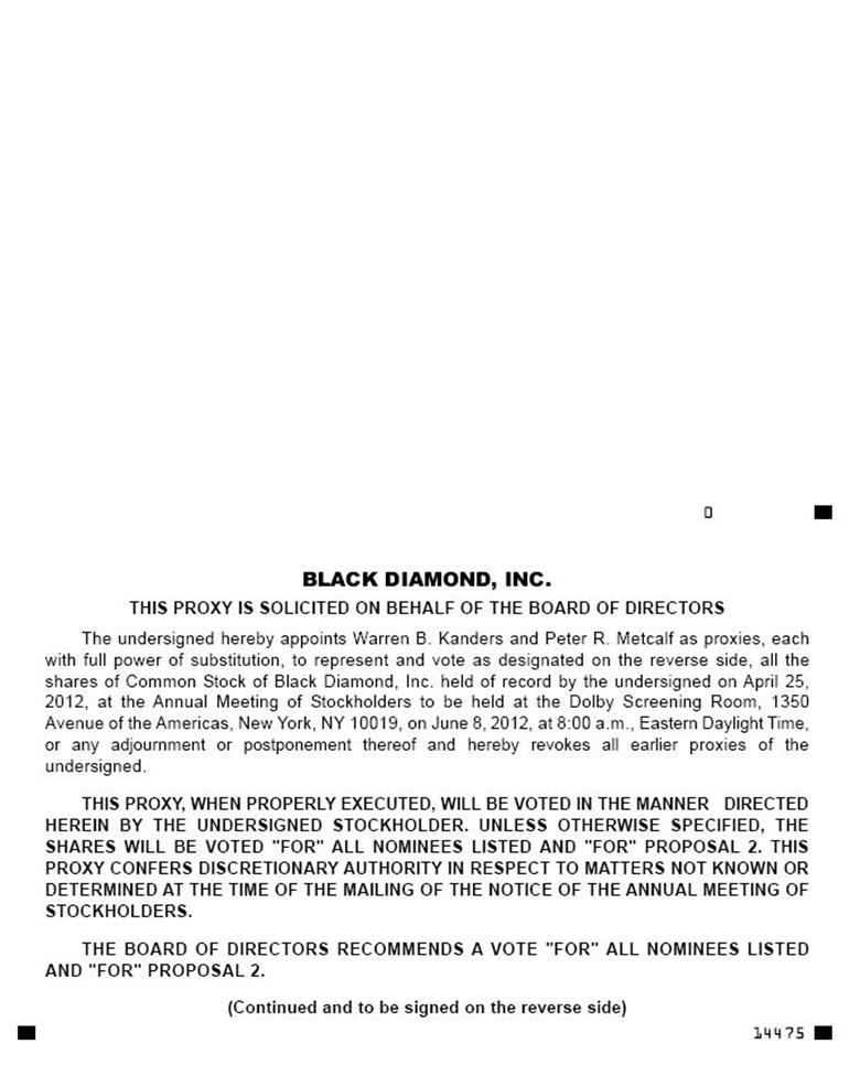 You are cordially invited to attend the Annual Meeting of Stockholders, and any adjournments or postponements thereof (the “Meeting”), of Black Diamond, Inc. (the “Company” or “Black Diamond”), which will be held on June 8, 2012, at 8:00 a.m., Eastern Daylight Time, at the Dolby Screening Room, 1350 Avenue of the Americas, New York, NY 10019, for the following purposes: