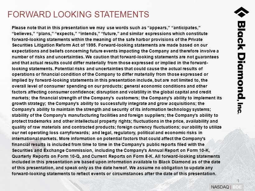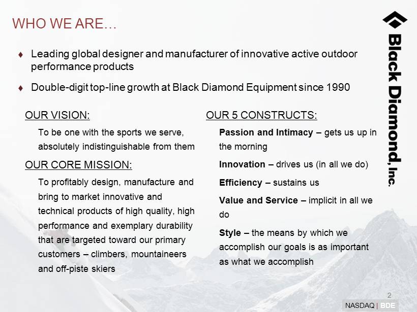 1 NASDAQ | BDE Please note that in this presentation we may use words such as “appears,” “anticipates,” “believes,” “plans,” “expects,” “intends,” “future,” and similar expressions which constitute forward - looking statements within the meaning of the safe harbor provisions of the Private Securities Litigation Reform Act of 1995. Forward - looking statements are made based on our expectations and beliefs concerning future events impacting the Company and therefore involve a number of risks and uncertainties. We caution that forward - looking statements are not guarantees and that actual results could differ materially from those expressed or implied in the forward - looking statements. Potential risks and uncertainties that could cause the actual results of operations or financial condition of the Company to differ materially from those expressed or implied by forward - looking statements in this presentation include, but are not limited to, the overall level of consumer spending on our products; general economic conditions and other factors affecting consumer confidence; disruption and volatility in the global capital and credit markets; the financial strength of the Company's customers; the Company's ability to implement its growth strategy; the Company's ability to successfully integrate and grow acquisitions; the Company's ability to maintain the strength and security of its information technology systems; stability of the Company's manufacturing facilities and foreign suppliers; the Company's ability to protect trademarks and other intellectual property rights; fluctuations in the price, availability and quality of raw materials and contracted products; foreign currency fluctuations; our ability to utilize our net operating loss carryforwards; and legal, regulatory, political and economic risks in international markets. More information on potential factors that could affect the Company's financial results is included from time to time in the Company's public reports filed with the Securities and Exchange Commission, including the Company's Annual Report on Form 10 - K, Quarterly Reports on Form 10 - Q, and Current Reports on Form 8 - K. All forward - looking statements included in this presentation are based upon information available to Black Diamond as of the date of this presentation, and speak only as the date hereof. We assume no obligation to update any forward - looking statements to reflect events or circumstances after the date of this presentation . FORWARD LOOKING STATEMENTS