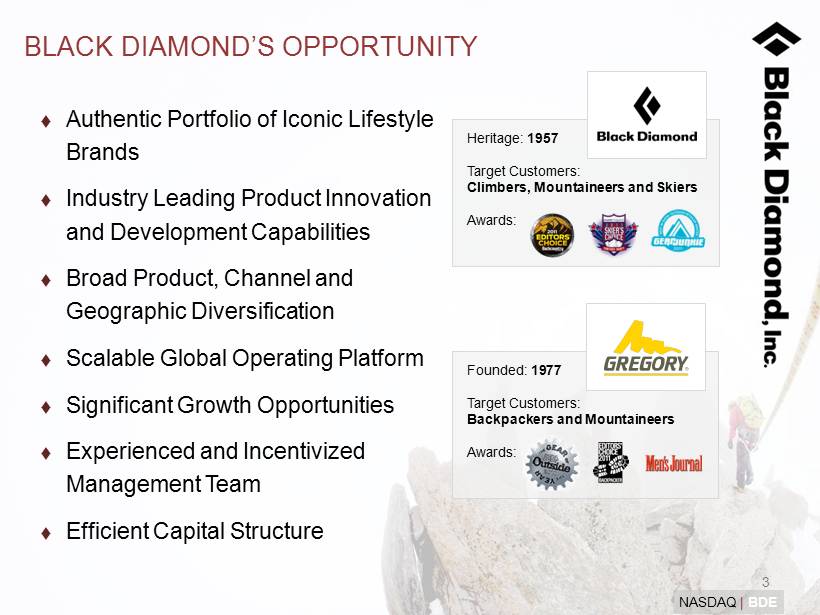 2 NASDAQ | BDE Leading global designer and manufacturer of innovative active outdoor performance products Double - digit top - line growth at Black Diamond Equipment since 1990 OUR 5 CONSTRUCTS : Passion and Intimacy – gets us up in the morning Innovation – drives us (in all we do) Efficiency – sustains us Value and Service – implicit in all we do Style – the means by which we accomplish our goals is as important as what we accomplish WHO WE ARE… OUR VISION : To be one with the sports we serve, absolutely indistinguishable from them OUR CORE MISSION : To profitably design, manufacture and bring to market innovative and technical products of high quality, high performance and exemplary durability that are targeted toward our primary customers – climbers, mountaineers and off - piste skiers