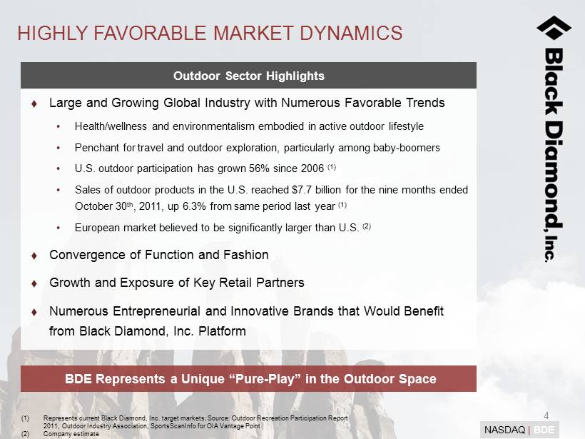 3 NASDAQ | BDE BLACK DIAMOND’S OPPORTUNITY Authentic Portfolio of Iconic Lifestyle Brands Industry Leading Product Innovation and Development Capabilities Broad Product, Channel and Geographic Diversification Scalable Global Operating Platform Significant Growth Opportunities Experienced and Incentivized Management Team Efficient Capital Structure Founded: 1977 Target Customers: Backpackers and Mountaineers Awards: Heritage: 1957 Target Customers: Climbers, Mountaineers and Skiers Awards: