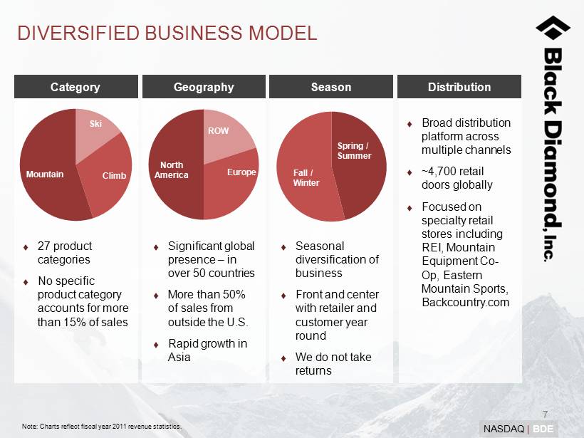 6 NASDAQ | BDE Marquee Introductions INDUSTRY LEADING PRODUCT INNOVATION AND DEVELOPMENT CAPABILITIES Legacy of redefining the categories in which we enter Strong track record of technical innovation and production development Portfolio of over 70 patents (1) Product development strives to elevate personal performance, safety and comfort Vertically integrated design and development process provides competitive advantage Key technical, highly engineered products manufactured in - house Gridlock ® Factor ® Z - Pole ® Spot Contoured Glove (1) Some patents are pending.