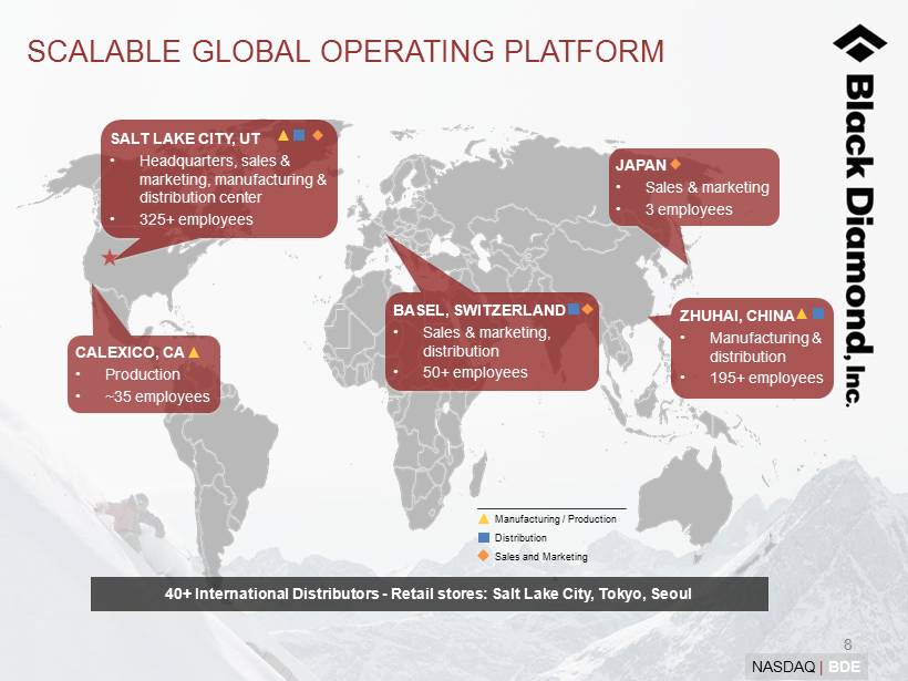 7 NASDAQ | BDE Category Geography Distribution 27 product categories No specific product category accounts for more than 15% of sales Significant global presence – in over 50 countries More than 50% of sales from outside the U.S . Rapid growth in Asia Broad distribution platform across multiple channels ~4,700 retail doors globally Focused on specialty retail stores including REI, Mountain Equipment Co - Op, Eastern Mountain Sports, Backcountry.com Note: Charts reflect fiscal year 2011 revenue statistics. Season Seasonal diversification of business Front and center with retailer and customer year round We do not take returns DIVERSIFIED BUSINESS MODEL Ski Climb Mountain ROW Europe North America Spring / Summer Fall / Winter