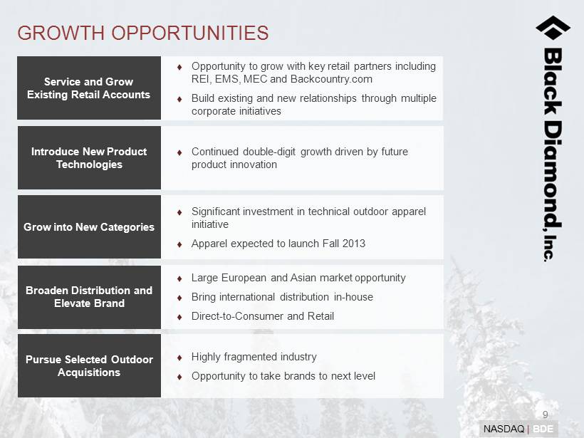 4 NASDAQ | BDE HIGHLY FAVORABLE MARKET DYNAMICS (1) Represents current Black Diamond, Inc. target markets; Source: Outdoor Recreation Participation Report 2011, Outdoor Industry Association, SportsScanInfo for OIA Vantage Point (2) Company estimate Outdoor Sector Highlights Large and Growing Global Industry with Numerous Favorable Trends • Health/wellness and environmentalism embodied in active outdoor lifestyle • Penchant for travel and outdoor exploration, particularly among baby - boomers • U.S. outdoor participation has grown 56% since 2006 (1) • Sales of outdoor products in the U.S. reached $7.7 billion for the nine months ended October 30 th , 2011, up 6.3% from same period last year (1) • European market believed to be significantly larger than U.S. (2) Convergence of Function and Fashion Growth and Exposure of Key Retail Partners Numerous Entrepreneurial and Innovative Brands that Would Benefit from Black Diamond, Inc. Platform BDE Represents a Unique “Pure - Play” in the Outdoor Space
