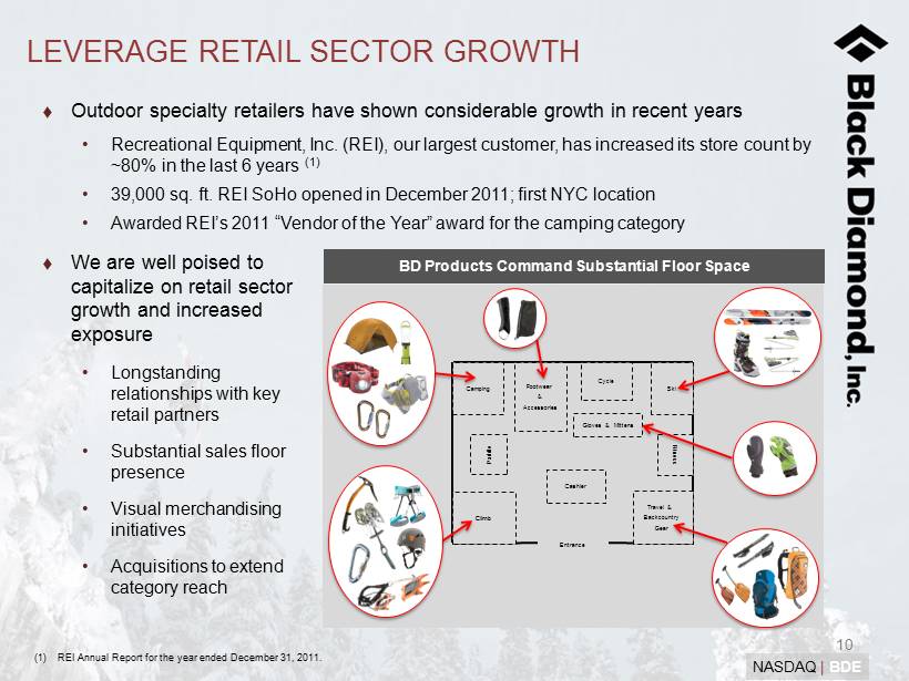 9 NASDAQ | BDE GROWTH OPPORTUNITIES Introduce New Product Technologies Continued double - digit growth driven by future product innovation Grow into New Categories Significant investment in technical outdoor apparel initiative Apparel expected to launch Fall 2013 Pursue Selected Outdoor Acquisitions Highly fragmented industry Opportunity to take brands to next level Service and Grow Existing Retail Accounts Broaden Distribution and Elevate Brand Large European and Asian market opportunity Bring international distribution in - house Direct - to - Consumer and Retail Opportunity to grow with key retail partners including REI, EMS, MEC and Backcountry.com Build existing and new relationships through multiple corporate initiatives