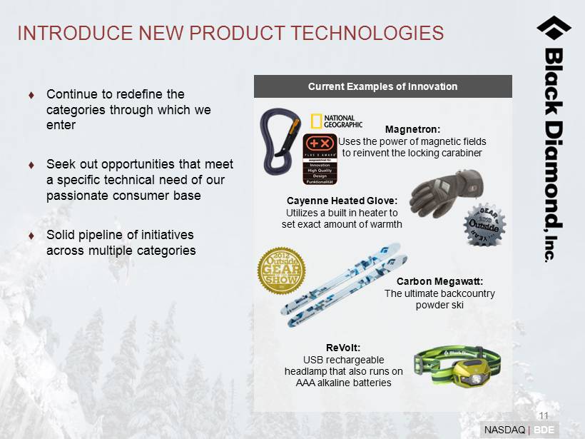 10 NASDAQ | BDE Entrance Cashier Camping Climb Ski Travel & Backcountry Gear Paddle Fitness Cycle Footwear & Accessories Gloves & Mittens LEVERAGE RETAIL SECTOR GROWTH BD Products Command Substantial Floor Space Outdoor specialty retailers have shown considerable growth in recent years • Recreational Equipment, Inc. (REI), our largest customer, has increased its store count by ~80% in the last 6 years (1) • 39,000 sq. ft. REI SoHo opened in December 2011; first NYC location • Awarded REI’s 2011 “Vendor of the Year” award for the camping category We are well poised to capitalize on retail sector growth and increased exposure • Longstanding relationships with key retail partners • Substantial sales floor presence • Visual merchandising initiatives • Acquisitions to extend category reach (1) REI Annual Report for the year ended December 31, 2011.