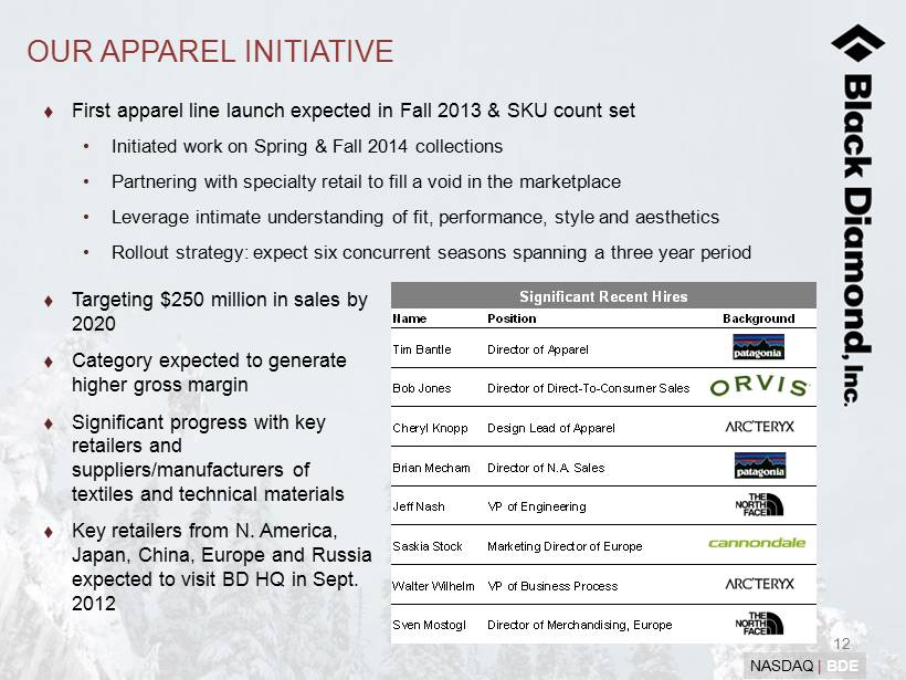 11 NASDAQ | BDE Current Examples of Innovation Magnetron: Uses the power of magnetic fields to reinvent the locking carabiner Cayenne Heated Glove: Utilizes a built in heater to set exact amount of warmth INTRODUCE NEW PRODUCT TECHNOLOGIES Continue to redefine the categories through which we enter Seek out opportunities that meet a specific technical need of our passionate consumer base Solid pipeline of initiatives across multiple categories Carbon Megawatt: The ultimate backcountry powder ski ReVolt: USB rechargeable headlamp that also runs on AAA alkaline batteries