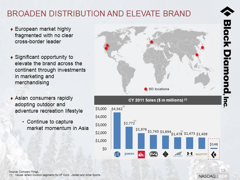 12 NASDAQ | BDE OUR APPAREL INITIATIVE Targeting $250 million in sales by 2020 Category expected to generate higher gross margin Significant progress with key retailers and suppliers/manufacturers of textiles and technical materials Key retailers from N. America, Japan, China, Europe and Russia expected to visit BD HQ in Sept. 2012 First apparel line launch expected in Fall 2013 & SKU count set • Initiated work on Spring & Fall 2014 collections • Partnering with specialty retail to fill a void in the marketplace • Leverage intimate understanding of fit, performance, style and aesthetics • Rollout strategy: expect six concurrent seasons spanning a three year period Significant Recent Hires Name Position Background Tim Bantle Director of Apparel Bob Jones Director of Direct-To-Consumer Sales Cheryl Knopp Design Lead of Apparel Brian Mecham Director of N.A. Sales Jeff Nash VP of Engineering Saskia Stock Marketing Director of Europe Walter Wilhelm VP of Business Process Sven Mostogl Director of Merchandising, Europe