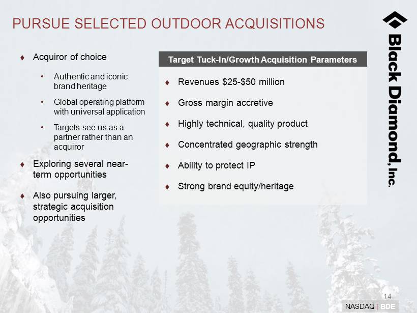 13 NASDAQ | BDE BROADEN DISTRIBUTION AND ELEVATE BRAND European market highly fragmented with no clear cross - border leader Significant opportunity to elevate the brand across the continent through investments in marketing and merchandising Asian consumers rapidly adopting outdoor and adventure recreation lifestyle • Continue to capture market momentum in Asia 2010 Sales by Geography ($ in mm) CY 2011 Sales ($ in millions) ( 1 ) $4,562 $2,772 $1,976 $1,745 $1,694 $1,478 $1,473 $1,409 $146 $0 $1,000 $2,000 $3,000 $4,000 $5,000 (1) (1) (1) BD locations Source: Company filings . (1) Values reflect Outdoor segments for VF Corp., Jarden and Amer Sports.