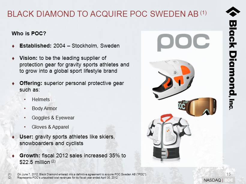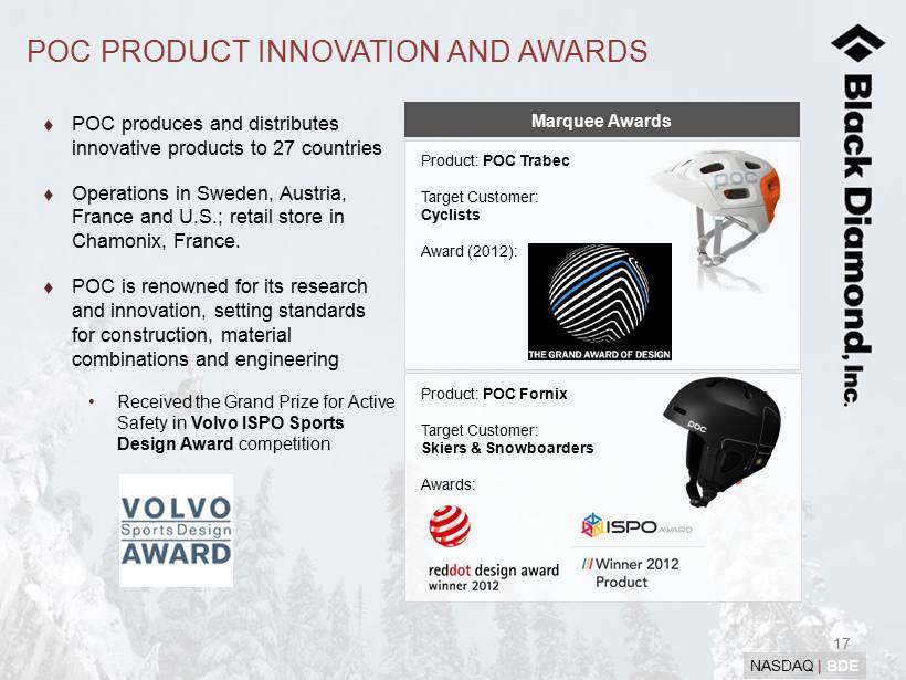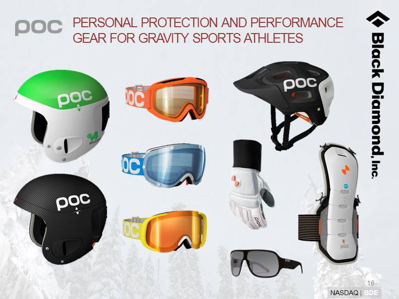 15 NASDAQ | BDE BLACK DIAMOND TO ACQUIRE POC SWEDEN AB (1) Who is POC? Established: 2004 – Stockholm, Sweden Vision: to be the leading supplier of protection gear for gravity sports athletes and to grow into a global sport lifestyle brand Offering: superior personal protective gear such as: • Helmets • Body Armor • Goggles & Eyewear • Gloves & Apparel User: gravity sports athletes like skiers, snowboarders and cyclists Growth: f iscal 2012 sales increased 35% to $22.5 million (2) (1) On June 7, 2012, Black Diamond entered into a definitive agreement to acquire POC Sweden AB (“POC”). (2) Represents POC’s unaudited total revenues for its fiscal year ended April 30, 2012.