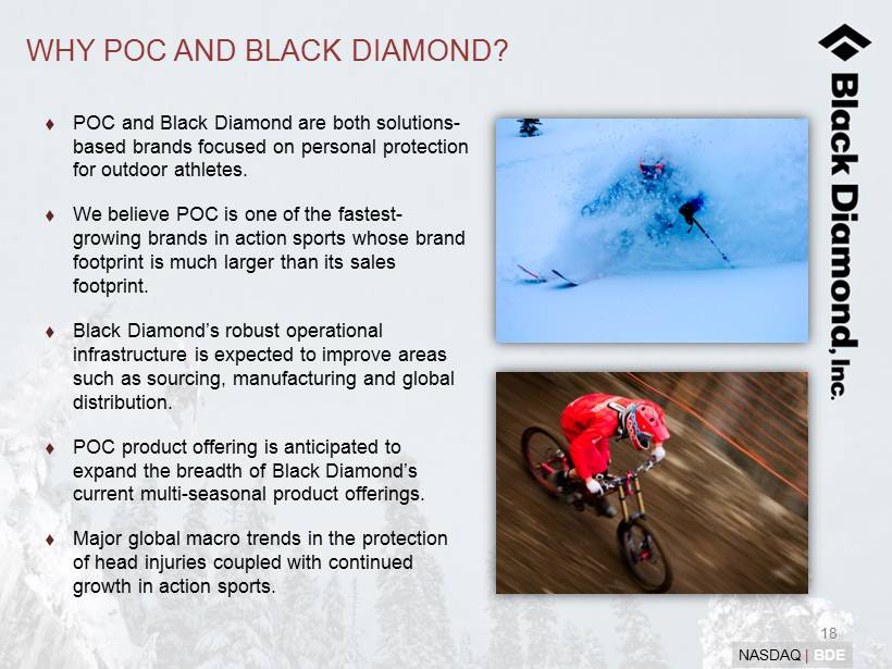 17 NASDAQ | BDE POC produces and distributes innovative products to 27 countries Operations in Sweden, Austria, France and U.S.; retail store in Chamonix, France. The POC Lab is renowned for its research and innovation, setting standards for construction, material combinations and engineering • Received the Grand Prize for Active Safety in Volvo ISPO Sports Design Award competition POC PRODUCT INNOVATION AND AWARDS Product: POC Trabec Target Customer: Cyclists Award (2012): Product: POC Fornix Target Customer: Skiers & Snowboarders Awards: Marquee Awards