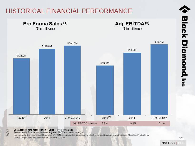21 NASDAQ | BDE $146 $500 $104 $250 $250 2011 2015 2020 BUILDING A $500 MILLION BUSINESS Growth Plan Targets ($ in millions) Over 50% potential organic growth through execution of base business strategy Acquisitions expected to contribute $250 million to top - line sales by 2015 Apparel expected to contribute more than $250 million in sales by 2020 Organic Apparel Acquisitions Incremental