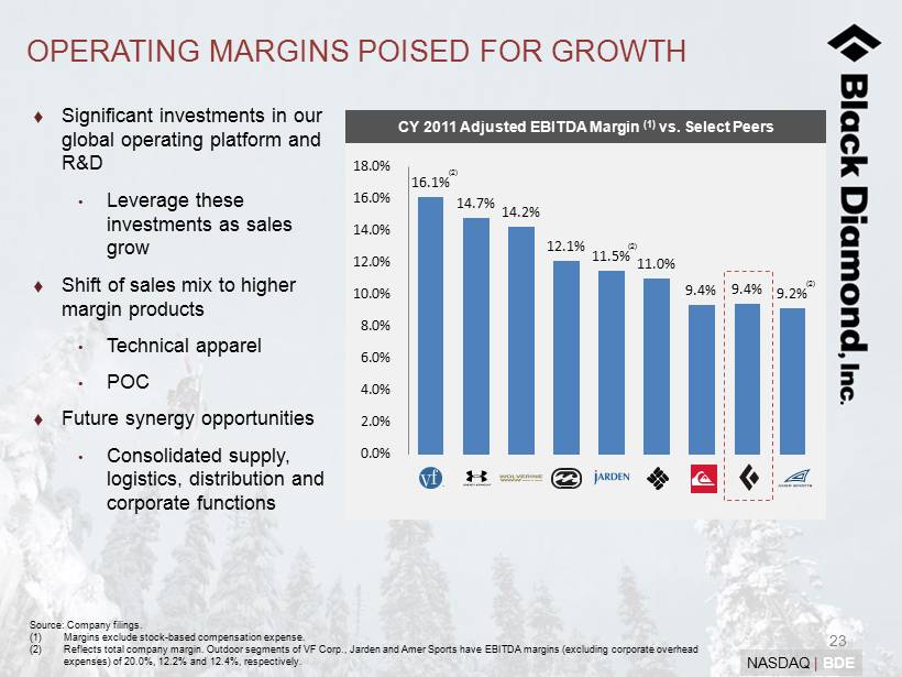 22 NASDAQ | BDE HISTORICAL FINANCIAL PERFORMANCE Adj. EBITDA (2) ($ in millions) Pro Forma Sales (1) ($ in millions) $125.0M $145.8M $153.1M 2010 2011 LTM 3/31/12 (1) See Appendix for a reconciliation of Sales to Pro Forma Sales. (2) See Appendix for a reconciliation of Adjusted EBITDA to net income (loss). (3) Pro forma for the year ended December 31, 2010 assuming the acquisition of Black Diamond Equipment and Gregory Mountain Produ cts by Clarus Corporation had occurred on January 1, 2010. (3) $10.8M $13.6M $15.4M 2010 2011 LTM 3/31/12 (3) Adj. EBITDA Margin 8.7% 9.4% 10.1%