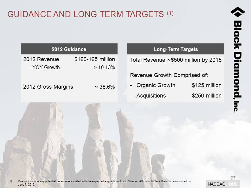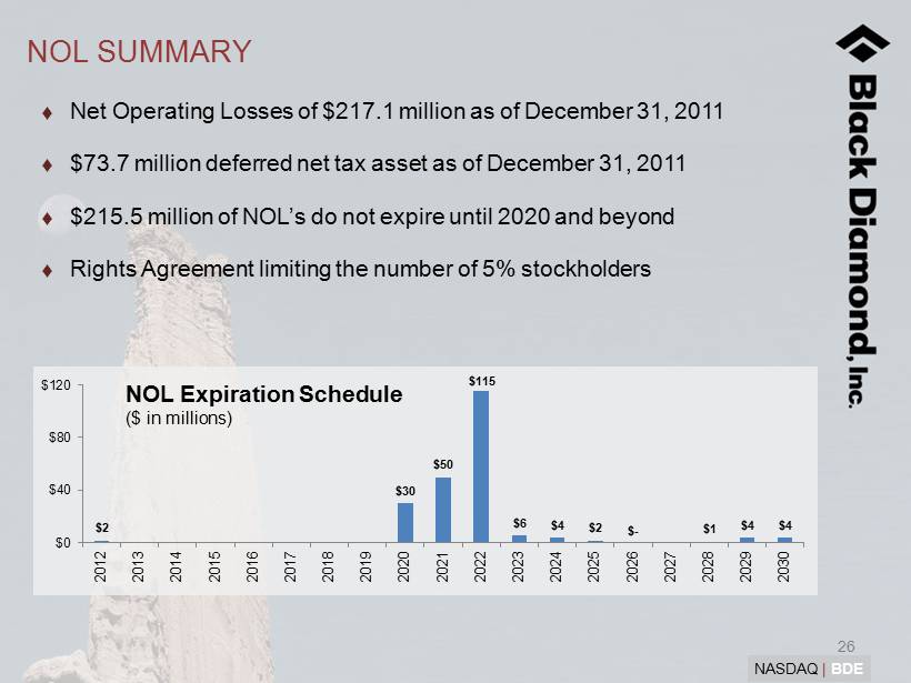 25 NASDAQ | BDE BALANCE SHEET SUPPORTS GROWTH (1) Growth - oriented balance sheet • Revolver capacity of $35.0 million as of 3/31/2012 • On Feb 22 , closed a public offering for 8.9 million shares at $7.50 for net proceeds of $63.4 million NOLs of $217.1 million as of Dec 31, 2011 protect future cash flow $73.7 million deferred net tax assets as of Dec 31, 2011 (1) Does not reflect Black Diamond’s pending acquisition of POC Sweden AB, announced on June 7, 2012. (2) Reflects carrying value; face value of $22.6 million. (3) See Appendix for reconciliation of Adjusted EBITDA to net income (loss ). Capitalization (1) ($ in millions)