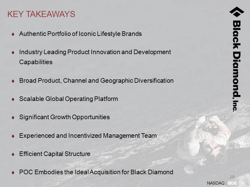 27 NASDAQ | BDE GUIDANCE AND LONG - TERM TARGETS (1) Total Revenue ~$500 million by 2015 Revenue Growth Comprised of: - Organic Growth $125 million - Acquisitions $250 million Long - Term Targets 2012 Revenue $160 - 165 million - YOY Growth > 10 - 13% 2012 Gross Margins ~ 38.6% 2012 Guidance (1) Does not include any potential revenue associated with the expected acquisition of POC Sweden AB , which Black Diamond announced on June 7, 2012.