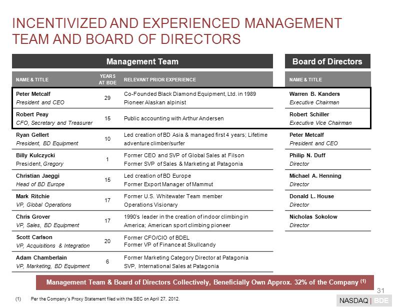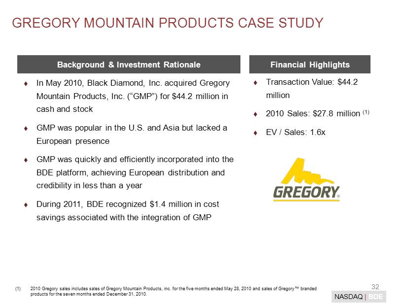 31 NASDAQ | BDE NAME & TITLE YEARS AT BDE RELEVANT PRIOR EXPERIENCE Peter Metcalf President and CEO 29 Co - Founded Black Diamond Equipment, Ltd. in 1989 Pioneer Alaskan alpinist Robert Peay CFO, Secretary and Treasurer 15 Public accounting with Arthur Andersen Ryan Gellert President, BD Equipment 10 Led creation of BD Asia & managed first 4 years; Lifetime adventure climber/surfer Billy Kulczycki President, Gregory 1 Former CEO and SVP of Global Sales at Filson Former SVP of Sales & Marketing at Patagonia Christian Jaeggi Head of BD Europe 15 Led creation of BD Europe Former Export Manager of Mammut Mark Ritchie VP, Global Operations 17 Former U.S. Whitewater Team member Operations Visionary Chris Grover VP, Sales, BD Equipment 17 1990’s leader in the creation of indoor climbing in America; American sport climbing pioneer Scott Carlson VP, Acquisitions & Integration 20 Former CFO/CIO of BDEL Former VP of Finance at Skullcandy Adam Chamberlain VP, Marketing, BD Equipment 6 Former Marketing Category Director at Patagonia SVP, International Sales at Patagonia INCENTIVIZED AND EXPERIENCED MANAGEMENT TEAM AND BOARD OF DIRECTORS NAME & TITLE Warren B. Kanders Executive Chairman Robert Schiller Executive Vice Chairman Peter Metcalf President and CEO Philip N. Duff Director Michael A. Henning Director Donald L. House Director Nicholas Sokolow Director Management Team Board of Directors Management Team & Board of Directors Collectively, Beneficially Own Approx. 32% of the Company (1) (1) Per the Company’s Proxy Statement filed with the SEC on April 27 , 2012.