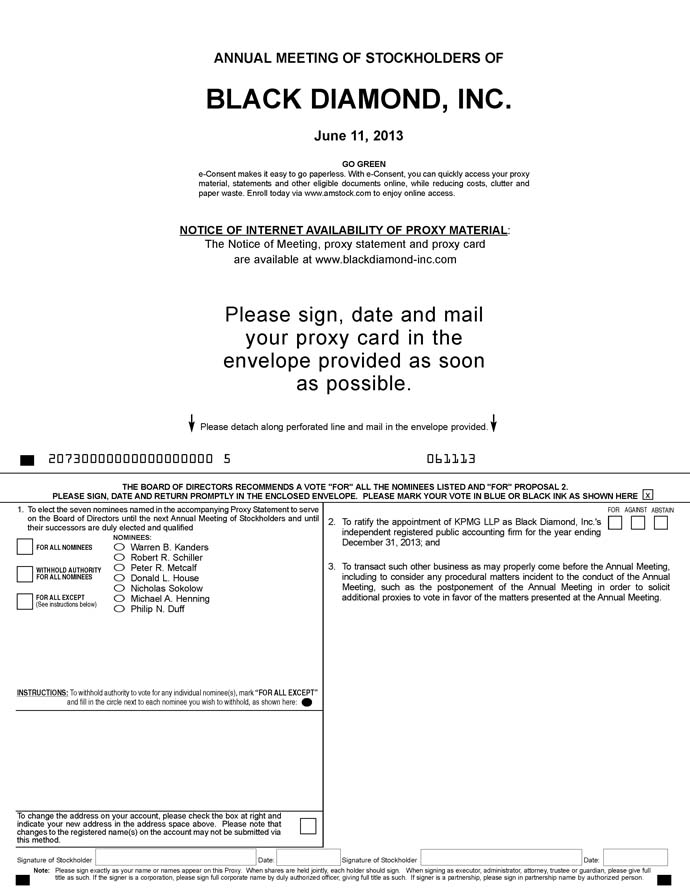 Important Notice Regarding the Availability of Proxy Materials for the Stockholder Meeting to Be Held on June 11, 2013: This Proxy Statement and form of proxy card, along with our Annual Report on Form 10-K for the fiscal year ended December 31, 2012, are available at www.blackdiamond-inc.com.