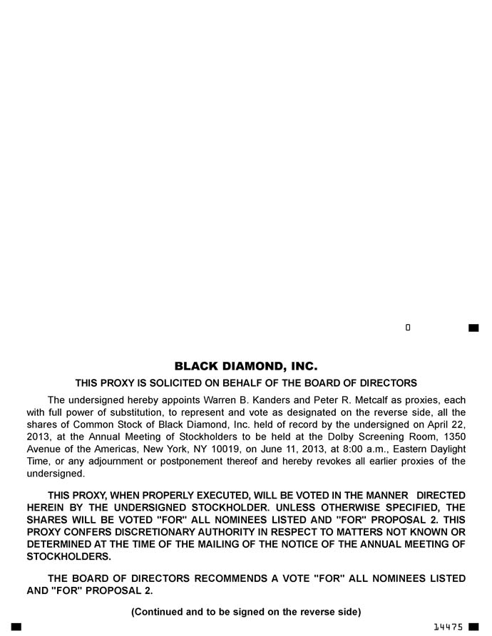 You are cordially invited to attend the Annual Meeting of Stockholders, and any adjournments or postponements thereof (the “Meeting”), of Black Diamond, Inc. (the “Company” or “Black Diamond”), which will be held on June 11, 2013, at 8:00 a.m., Eastern Daylight Time, at the Dolby Screening Room, 1350 Avenue of the Americas, New York, NY 10019, for the following purposes: