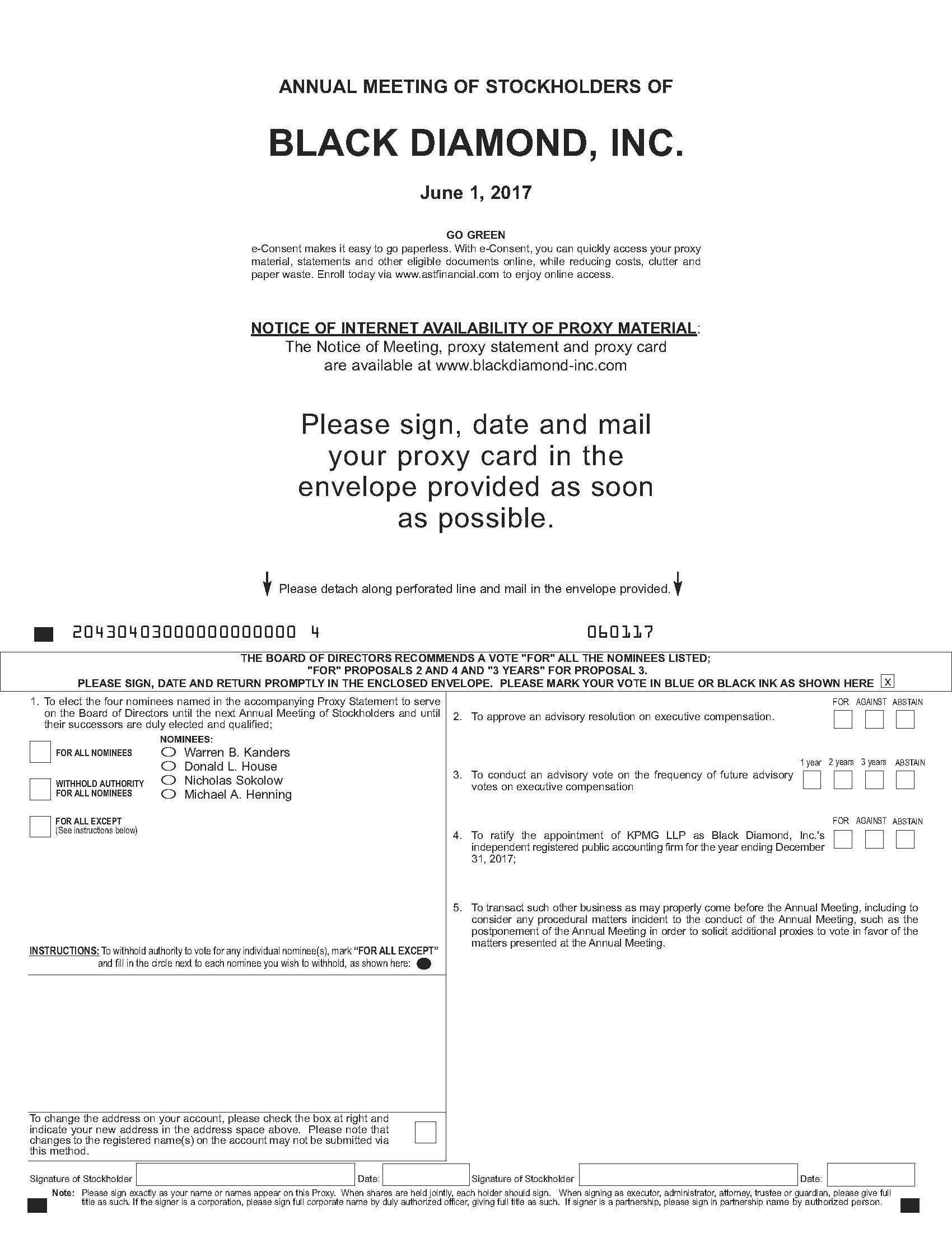 Important Notice Regarding the Availability of Proxy Materials for the Stockholders Meeting to Be Held on June 1, 2017: This Proxy Statement and form of proxy card, along with our Annual Report on Form 10-K for the fiscal year ended December 31, 2016, are available at www.blackdiamond-inc.com.