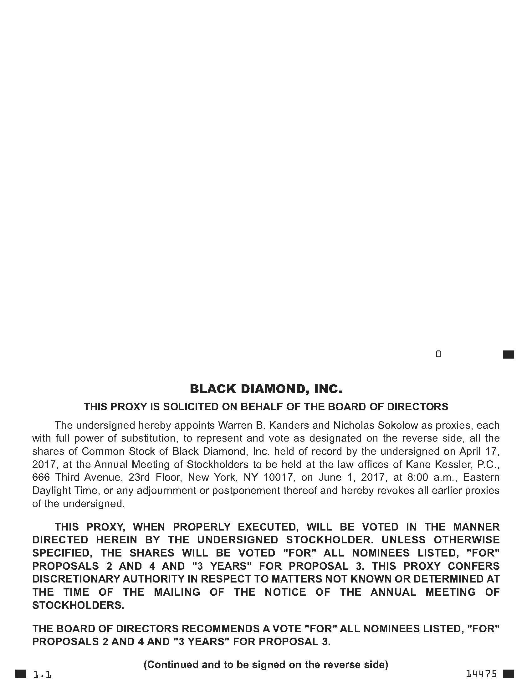 You are cordially invited to attend the Annual Meeting of Stockholders, and any adjournments or postponements thereof (the “Meeting”), of Black Diamond, Inc. (the “Company” or “Black Diamond”), which will be held on June 1, 2017, at 8:00 a.m., Eastern Daylight Savings Time, at the law offices of Kane Kessler, P.C, 666 Third Avenue, 23rd Floor, New York, NY 10017, for the following purposes: