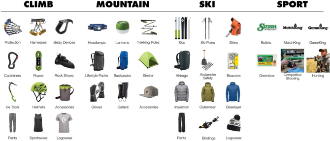 Our products span 30 single product categories and include a wide variety of technical outdoor equipment and lifestyle products for a wide range of outdoor enthusiasts, including climbers, skiers, backpackers and campers, competitive shooters, hunters and other outdoor-inspired consumers. We design many of our products for extreme applications, such as high-altitude mountaineering, ice and rock climbing, as well as backcountry skiing and alpine touring. We also manufacturer high quality bullets with the tightest tolerances in the industry that enhance the performance of competitive shooters and hunters. Generally, we divide our product offerings into the following four primary categories: