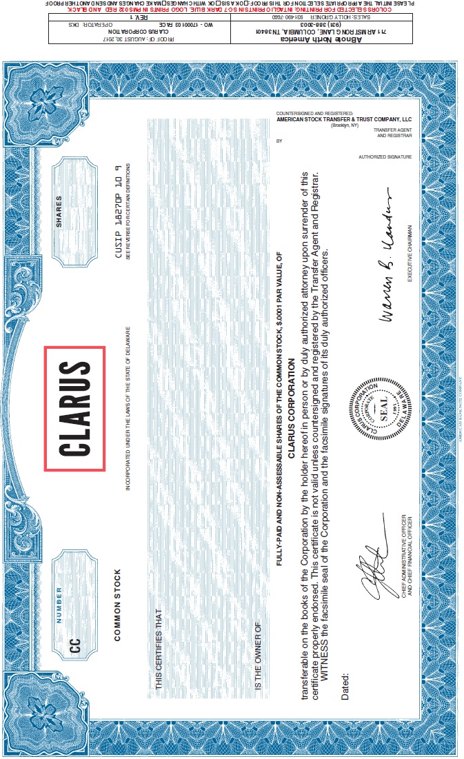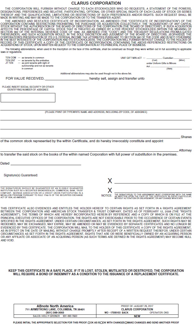 CLARUS CORPORATION THE CORPORATION WILL FURNISH WITHOUT CHARGE TO EACH STOCKHOLDER WHO SO REQUESTS, A STATEMENT OF THE POWERS, DESIGNATIONS, PREFERENCES AND RELATIVE, PARTICIPATING, OPTIONAL OR OTHER SPECIAL RIGHTS OF EACH CLASS OF STOCK OR SERIES THEREOF AND THE QUALIFICATIONS, LIMITATIONS OR RESTRICTIONS OF SUCH PREFERENCES AND/OR RIGHTS. SUCH REQUEST SHALL BE MADE IN WRITING AND MAY BE MADE TO THE CORPORATION OR TO THE TRANSFER AGENT. THE AMENDED AND RESTATED CERTIFICATE OF INCORPORATION, AS AMENDED (THE “CERTIFICATE OF INCORPORATION”) OF THE CORPORATION CONTAINS RESTRICTIONS PROHIBITING THE PURCHASE OR ACQUISITION (COLLECTIVELY, THE “ACQUISITION”) OF ANY CAPITAL STOCK WITHOUT THE AUTHORIZATION OF THE BOARD OF DIRECTORS OF THE CORPORATION (THE “BOARD OF DIRECTORS”), IF SUCH ACQUISITION AFFECTS THE PERCENTAGE OF CAPITAL STOCK THAT IS TREATED AS OWNED BY A FIVE PERCENT STOCKHOLDER (WITHIN THE MEANING OF SECTION 382 OF THE INTERNAL REVENUE CODE OF 1986, AS AMENDED (THE “CODE”) AND THE TREASURY REGULATIONS PROMULGATED THEREUNDER), AND SUCH ACQUISITION WOULD, IN THE SOLE DISCRETION AND JUDGMENT OF THE BOARD OF DIRECTORS, JEOPARDIZE THE CORPORATION’S PRESERVATION OF ITS U.S. FEDERAL INCOME TAX ATTRIBUTES PURSUANT TO SECTION 382 OF THE CODE AND IS NOT OTHERWISE IN THE BEST INTERESTS OF THE CORPORATION AND ITS STOCKHOLDERS. THE CORPORATION WILL FURNISH WITHOUT CHARGE TO THE HOLDER OF RECORD OF THIS CERTIFICATE A COPY OF THE CERTIFICATE OF INCORPORATION, CONTAINING THE ABOVE-REFERENCED RESTRICTIONS ON ACQUISITIONS OF STOCK, UPON WRITTEN REQUEST TO THE CORPORATION AT ITS PRINCIPAL PLACE OF BUSINESS. The following abbreviations, when used in the inscription on the face of this certificate, shall be construed as though they were written out in full according to applicable laws or regulations: TEN COM — as tenants in common TEN ENT — as tenants by the entireties JT TEN — as joint tenants with right of survivorship and not as tenants in common UNIF GIFT MIN ACT — ......................... Custodian .......................... (Cust) (Minor) under Uniform Gifts to Minors Act .............................................................. (State) Additional abbreviations may also be used though not in the above list. FOR VALUE RECEIVED, hereby sell, assign and transfer unto PLEASE INSERT SOCIAL SECURITY OR OTHER IDENTIFYING NUMBER OF ASSIGNEE (PLEASE PRINT OR TYPEWRITE NAME AND ADDRESS, INCLUDING ZIP CODE, OF ASSIGNEE) Shares of the common stock represented by the within Certificate, and do hereby irrevocably constitute and appoint Attorney to transfer the said stock on the books of the within named Corporation with full power of substitution in the premises. Dated Signature(s) Guaranteed: THE SIGNATURE(S) SHOULD BE GUARANTEED BY AN ELIGIBLE GUARANTOR INSTITUTION SUCH AS A SECURITIES BROKER/DEALER, COMMERCIAL BANK, TRUST COMPANY, SAVINGS ASSOCIATION OR A CREDIT UNION PARTICIPATING IN A MEDALLION PROGRAM PURSUANT TO RULE 17Ad-15 OF THE SECURITIES EXCHANGE ACT OF 1934, AS AMENDED. X X NOTICE: THE SIGNATURE(S) TO THIS ASSIGNMENT MUST CORRESPOND WITH THE NAME AS WRITTEN UPON THE FACE OF THE CERTIFICATE IN EVERY PARTICULAR, WITHOUT ALTERATION OR ENLARGEMENT, OR ANY CHANGE WHATEVER. THIS CERTIFICATE ALSO EVIDENCES AND ENTITLES THE HOLDER HEREOF TO CERTAIN RIGHTS AS SET FORTH IN A RIGHTS AGREEMENT BETWEEN THE CORPORATION AND AMERICAN STOCK TRANSFER & TRUST COMPANY, DATED AS OF FEBRUARY 12, 2008 (THE “RIGHTS AGREEMENT”), THE TERMS OF WHICH ARE HEREBY INCORPORATED HEREIN BY REFERENCE AND A COPY OF WHICH IS ON FILE AT THE PRINCIPAL EXECUTIVE OFFICES OF THE CORPORATION. THE RIGHTS ARE NOT EXERCISABLE PRIOR TO THE OCCURRENCE OF CERTAIN EVENTS SPECIFIED IN THE RIGHTS AGREEMENT. UNDER CERTAIN CIRCUMSTANCES, AS SET FORTH IN THE RIGHTS AGREEMENT, SUCH RIGHTS MAY BE REDEEMED, MAY BE EXCHANGED, MAY EXPIRE, MAY BE AMENDED OR MAY BE EVIDENCED BY SEPARATE CERTIFICATES AND NO LONGER BE EVIDENCED BY THIS CERTIFICATE. THE CORPORATION WILL MAIL TO THE HOLDER OF THIS CERTIFICATE A COPY OF THE RIGHTS AGREEMENT, AS IN EFFECT ON THE DATE OF MAILING, WITHOUT CHARGE PROMPTLY AFTER RECEIPT OF A WRITTEN REQUEST THEREFOR. UNDER CERTAIN CIRCUMSTANCES AS SET FORTH IN THE RIGHTS AGREEMENT, RIGHTS THAT ARE OR WERE BENEFICIALLY OWNED BY AN ACQUIRING PERSON OR ANY AFFILIATE OR ASSOCIATE OF AN ACQUIRING PERSON (AS SUCH TERMS ARE DEFINED IN THE RIGHTS AGREEMENT) MAY BECOME NULL AND VOID. KEEP THIS CERTIFICATE IN A SAFE PLACE. IF IT IS LOST, STOLEN, MUTILIATED OR DESTROYED, THE CORPORATION WILL REQUIRE A BOND OF INDEMNITY AS A CONDITION TO THE ISSUANCE OF A REPLACEMENT CERTIFICATE. ABnote North America PROOF OF: AUGUST 29, 2017 711 ARMSTRONG LANE, COLUMBIA, TN 38401 CLARUS CORPORATION (931) 388-3003 WO - 17000103 BACK OPERATOR: DKS SALES: HOLLY GRONER 931-490-7660 NEW PLEASE INITIAL THE APPROPRIATE SELECTION FOR THIS PROOF: OK AS IS OK WITH CHANGES MAKE CHANGES AND SEND ANOTHER PROOF